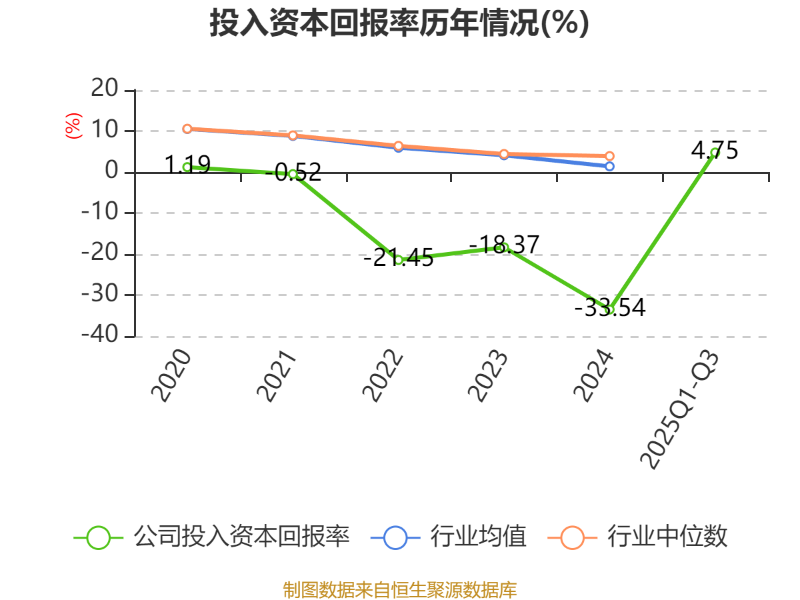 盈利能力方面, 2025年前三季度公司加权平均净资产收益率为6.47%,同比上升11.52个百分点。公司2025年前三季度投入资本回报率为4.75%,较上年同期上升5.62个百分点。