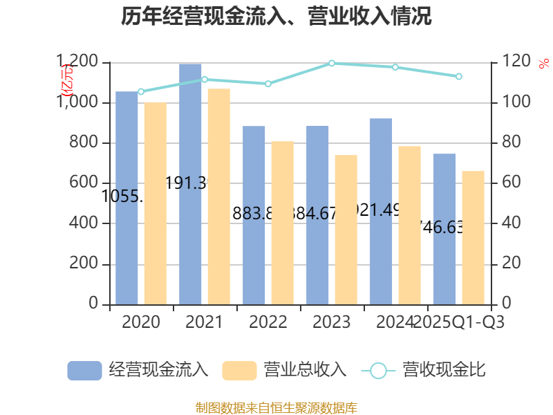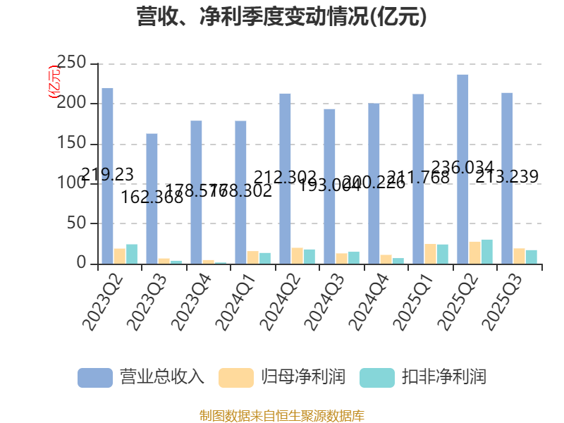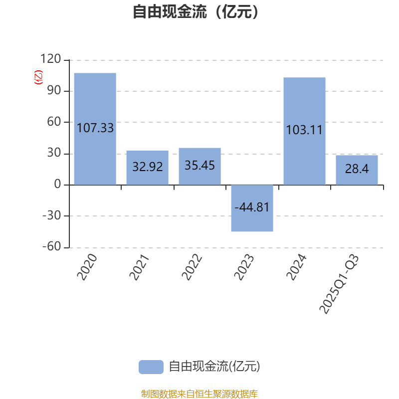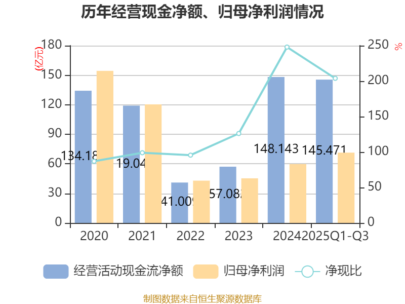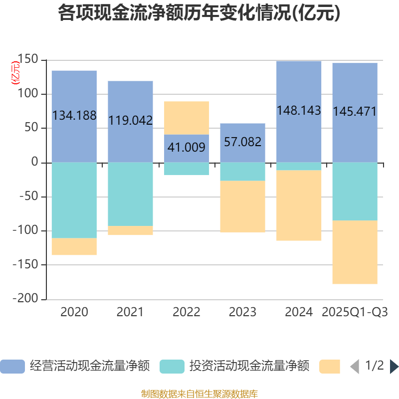 2025年前三季度,公司经营活动现金流净额为145.47亿元,同比增长17.55%;筹资活动现金流净额-92.82亿元,同比增加22.59亿元;投资活动现金流净额-84.92亿元,上年同期为-2.29亿元。