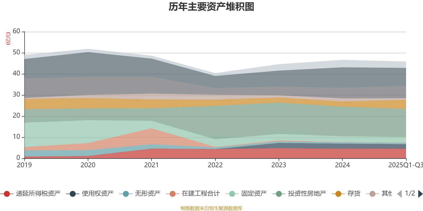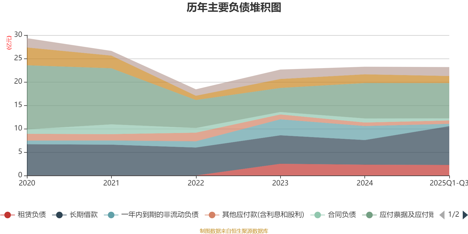 负债重大变化方面,截至2025年三季度末,公司长期借款较上年末增加57.6%,占公司总资产比重上升6.8个百分点;一年内到期的非流动负债较上年末减少83.12%,占公司总资产比重下降5.33个百分点;长期应付款合计占公司总资产的1.64%,上年末为0;合同负债较上年末减少49.76%,占公司总资产比重下降0.93个百分点。