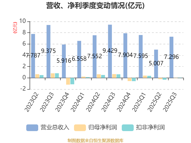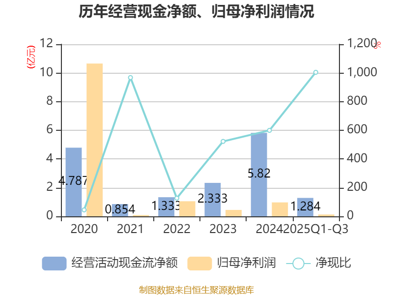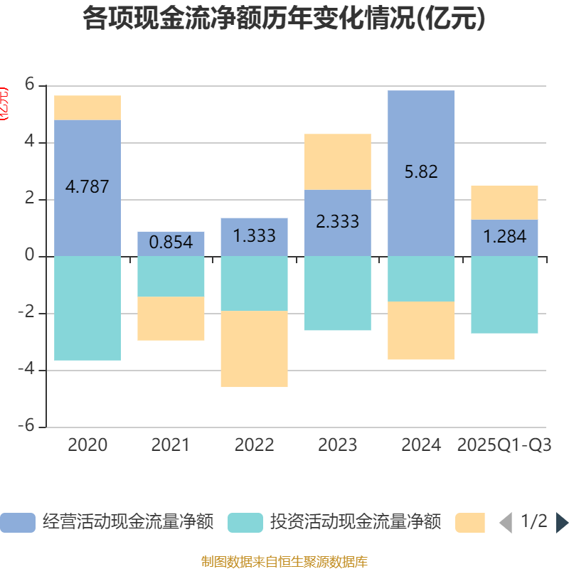 2025年前三季度,公司经营活动现金流净额为1.28亿元,同比下降41.31%;筹资活动现金流净额1.19亿元,同比增加1.57亿元;投资活动现金流净额-2.72亿元,上年同期为-2.75亿元。