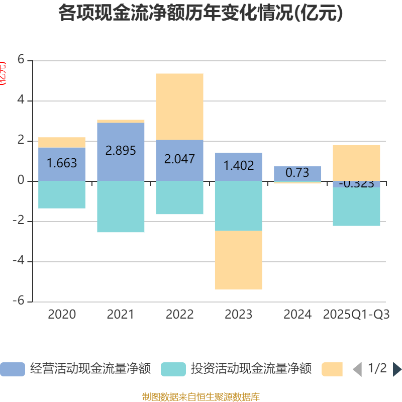 2025年前三季度,公司经营活动现金流净额为-3225.26万元,同比减少7654.05万元;筹资活动现金流净额1.78亿元,同比增加1.99亿元;投资活动现金流净额-1.91亿元,上年同期为-8821.39万元。