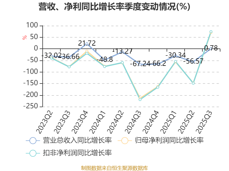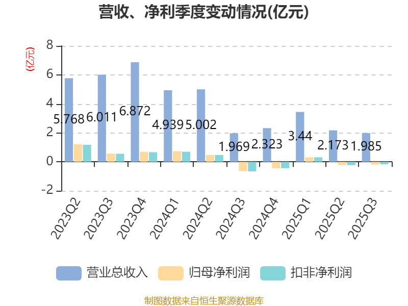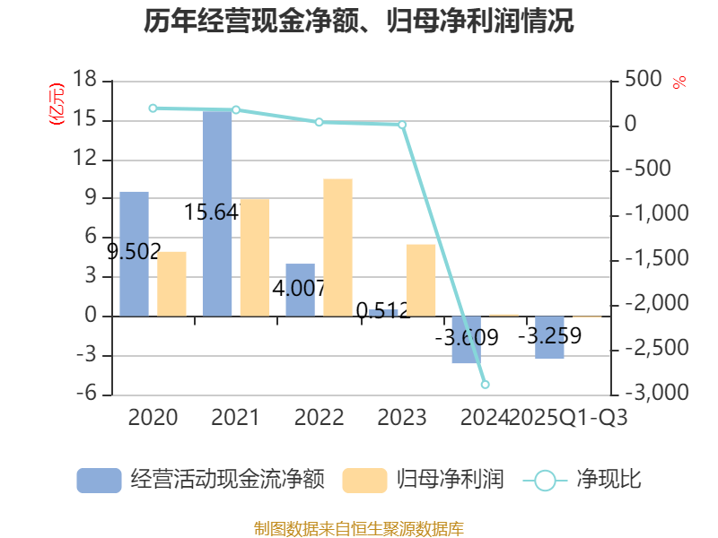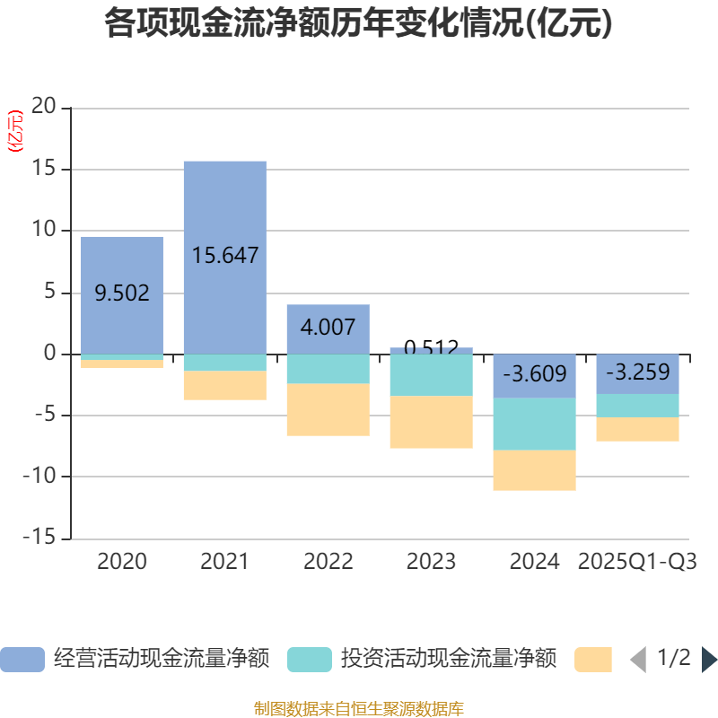 2025年前三季度,公司经营活动现金流净额为-3.26亿元,同比增加8546.61万元;筹资活动现金流净额-1.95亿元,同比增加1.31亿元;投资活动现金流净额-1.9亿元,上年同期为-2.83亿元。