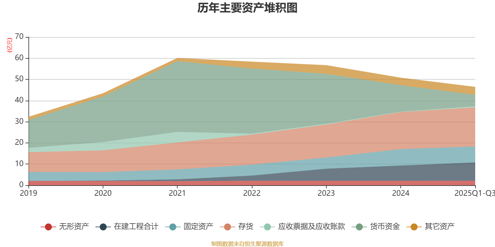 资产重大变化方面,截至2025年三季度末,公司货币资金较上年末减少56.81%,占公司总资产比重下降13个百分点;存货较上年末增加5.17%,占公司总资产比重上升5.16个百分点;在建工程合计较上年末增加19.63%,占公司总资产比重上升4.37个百分点;固定资产较上年末减少2.5%,占公司总资产比重上升1.01个百分点。