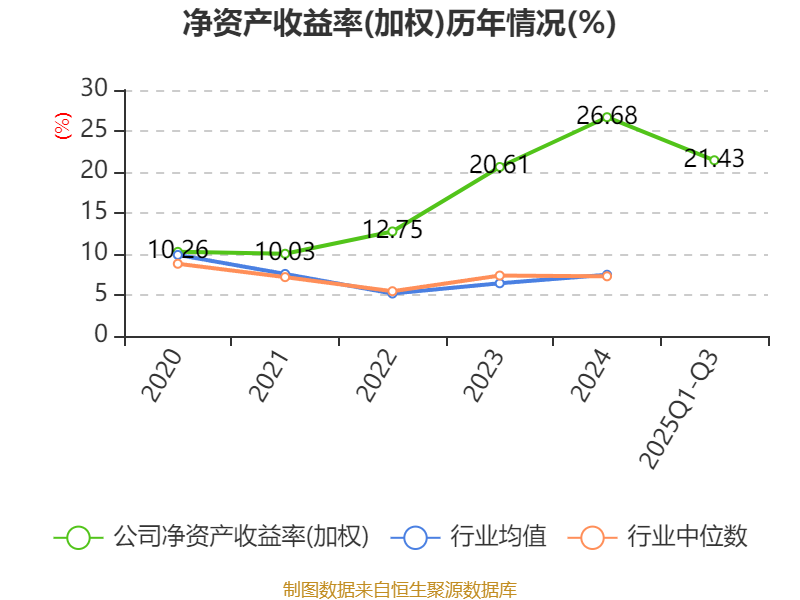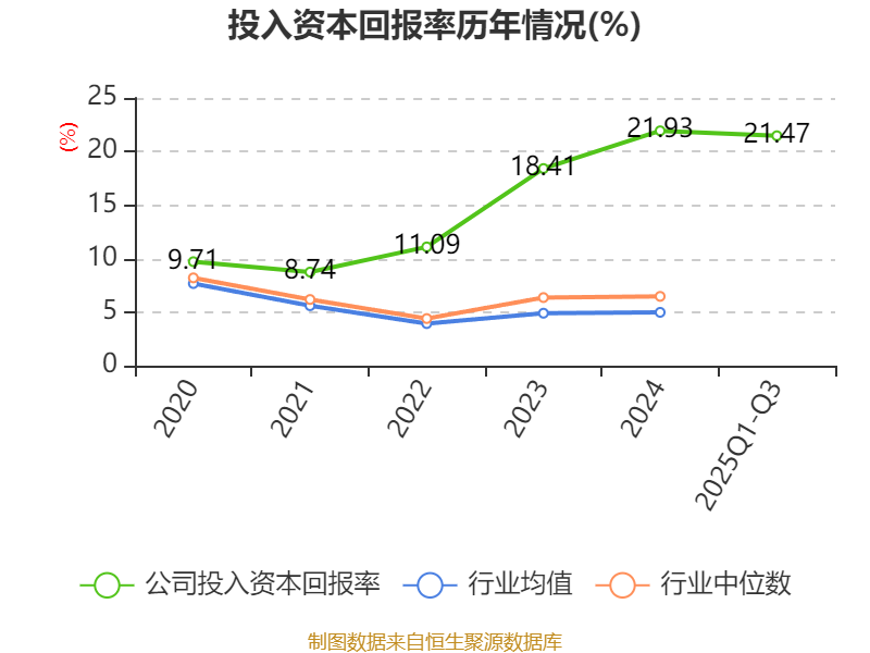盈利能力方面, 2025年前三季度公司加权平均净资产收益率为21.43%,同比上升5.32个百分点。公司2025年前三季度投入资本回报率为21.47%,较上年同期上升6.2个百分点。