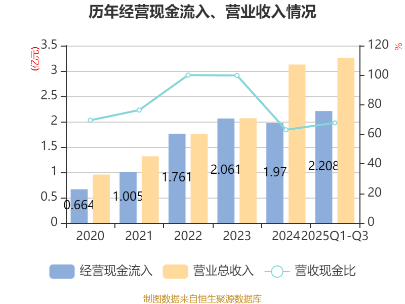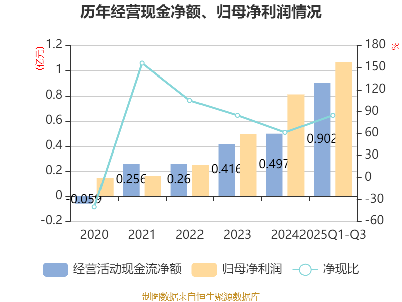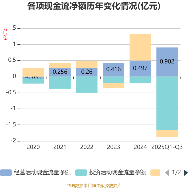 2025年前三季度,公司经营活动现金流净额为9015.57万元,同比增长193.04%;筹资活动现金流净额-2180.88万元,同比减少211.51万元;投资活动现金流净额-1.67亿元,上年同期为-2481.42万元。