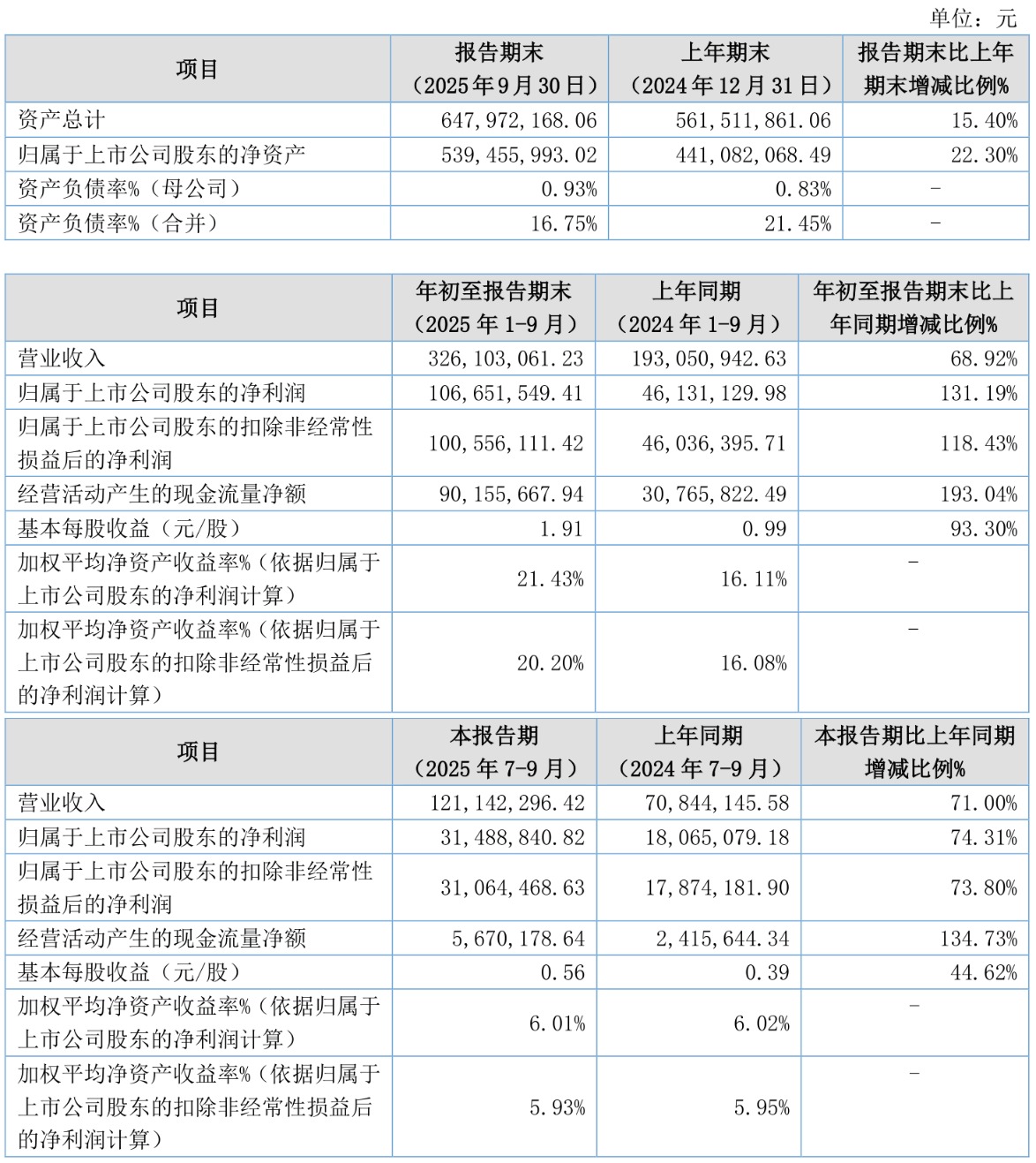 中证智能财讯林泰新材(920106)10月30日披露2025年第三季度报告。前三季度公司实现营业总收入3.26亿元,同比增长68.92%;归母净利润1.07亿元,同比增长131.19%;扣非净利润1.01亿元,同比增长118.43%;经营活动产生的现金流量净额为9015.57万元,同比增长193.04%;报告期内,林泰新材基本每股收益为1.91元,加权平均净资产收益率为21.43%。