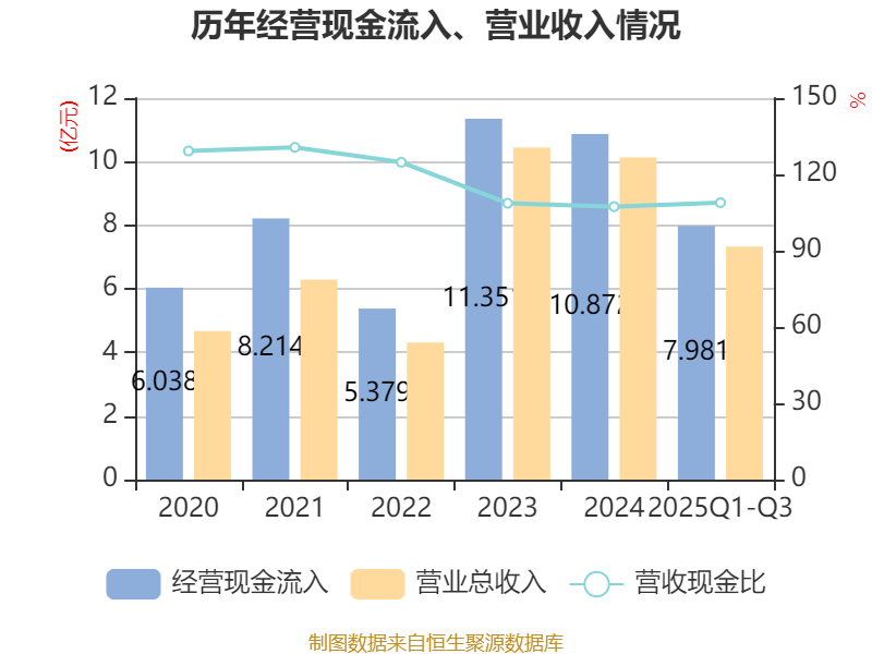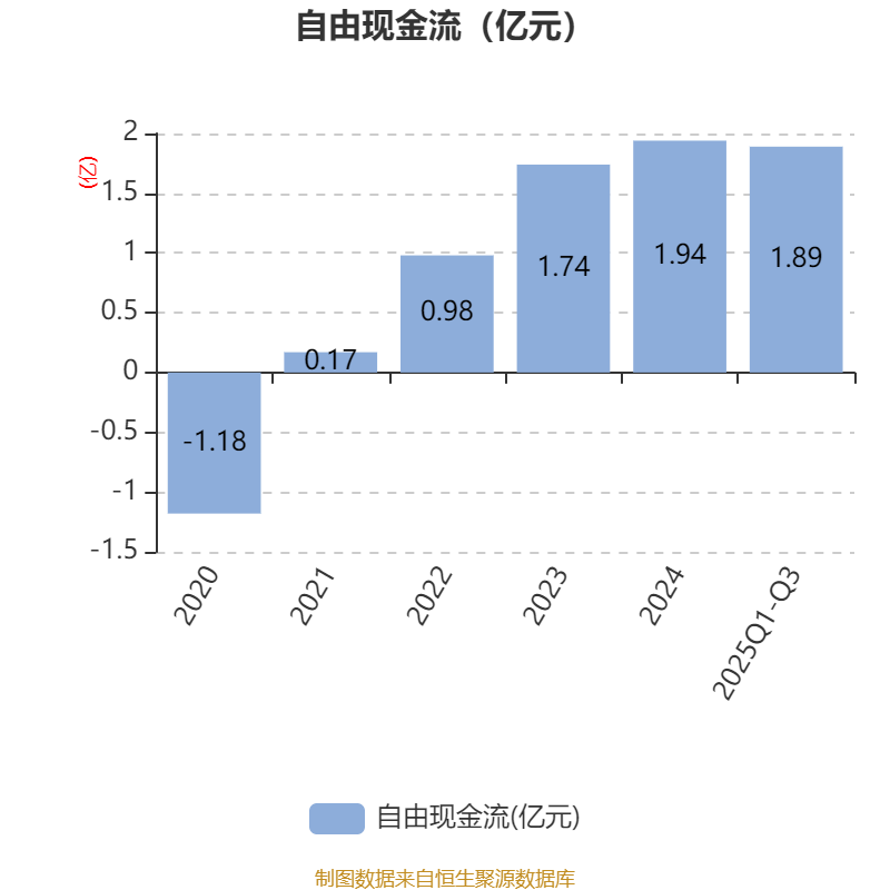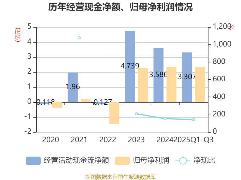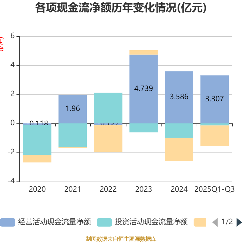 2025年前三季度,公司经营活动现金流净额为3.31亿元,同比下降6.74%;筹资活动现金流净额-1.42亿元,同比减少1917.41万元;投资活动现金流净额-1376.69万元,上年同期为-1.09亿元。