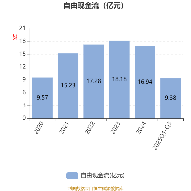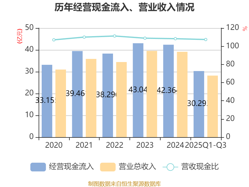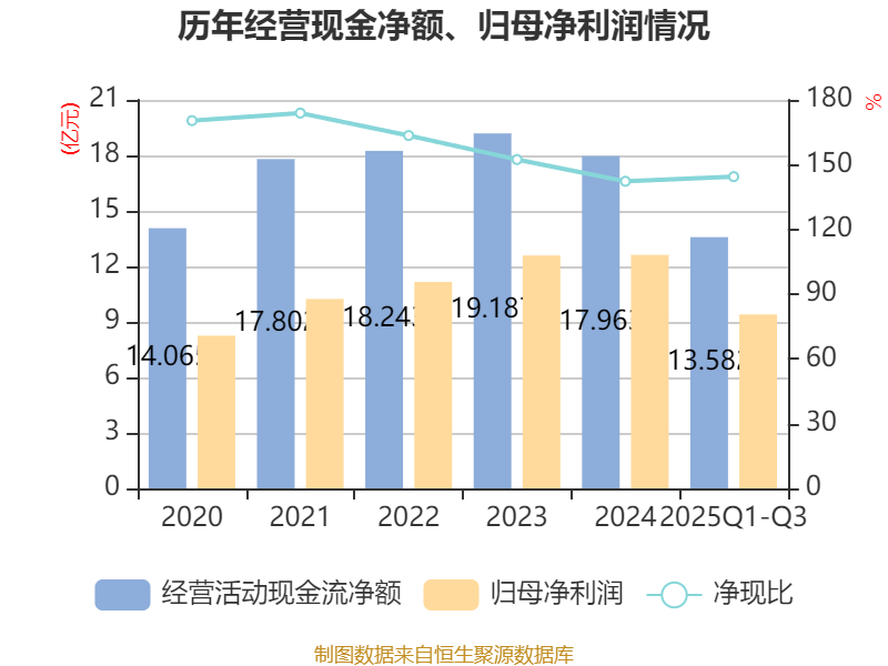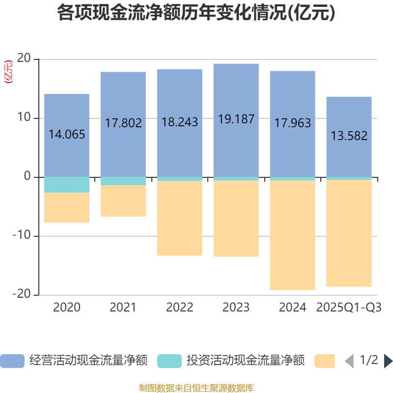 2025年前三季度,公司经营活动现金流净额为13.58亿元,同比下降9.12%;筹资活动现金流净额-18.15亿元,同比增加3135.39万元;投资活动现金流净额-5006.03万元,上年同期为-4095.12万元。