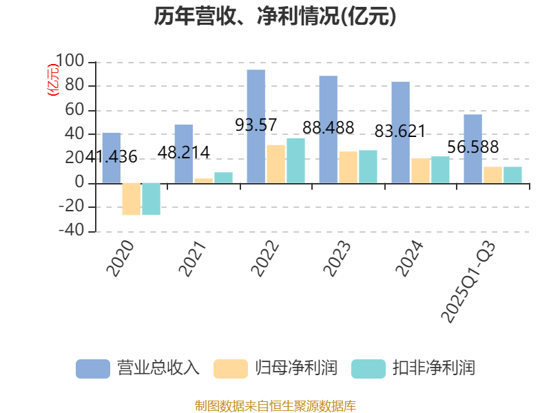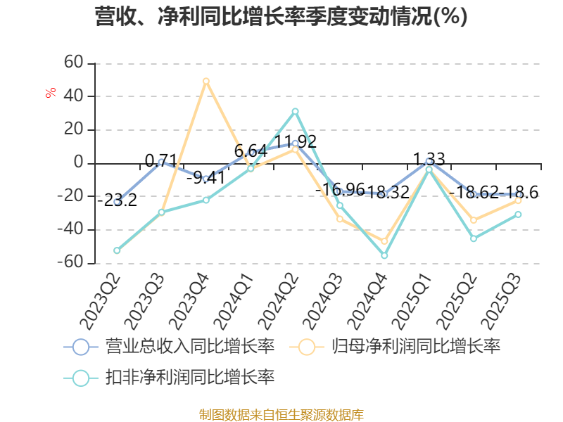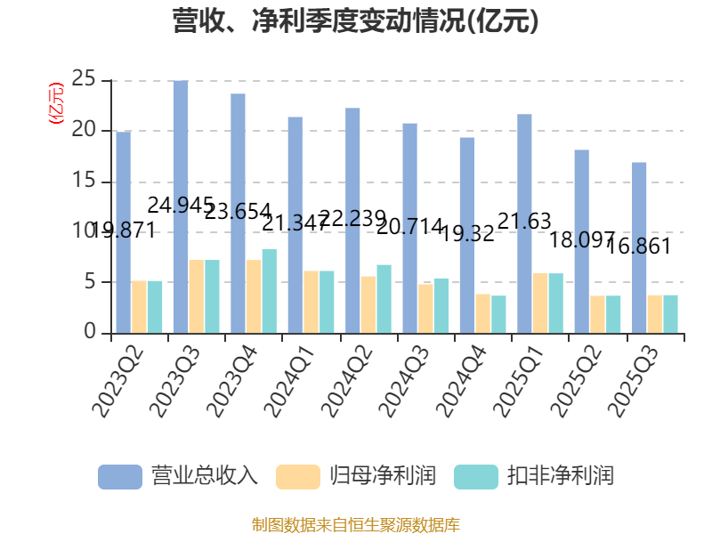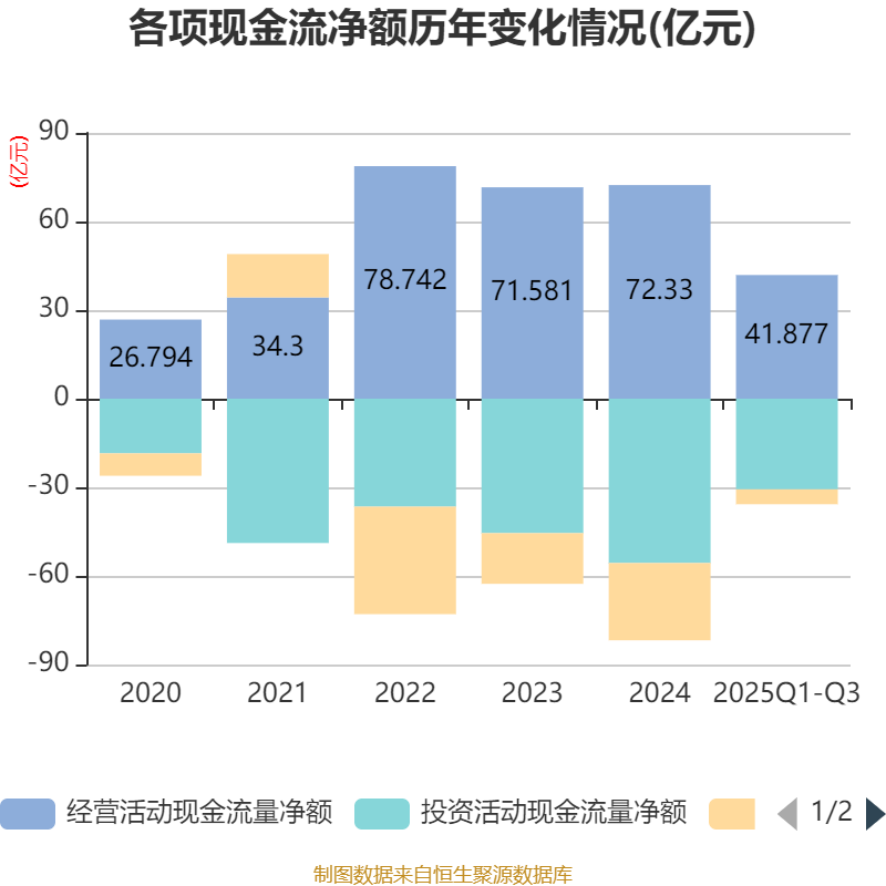 2025年前三季度,公司经营活动现金流净额为41.88亿元,同比下降24.87%;筹资活动现金流净额-5.04亿元,同比增加20.11亿元;投资活动现金流净额-30.69亿元,上年同期为-24.13亿元。