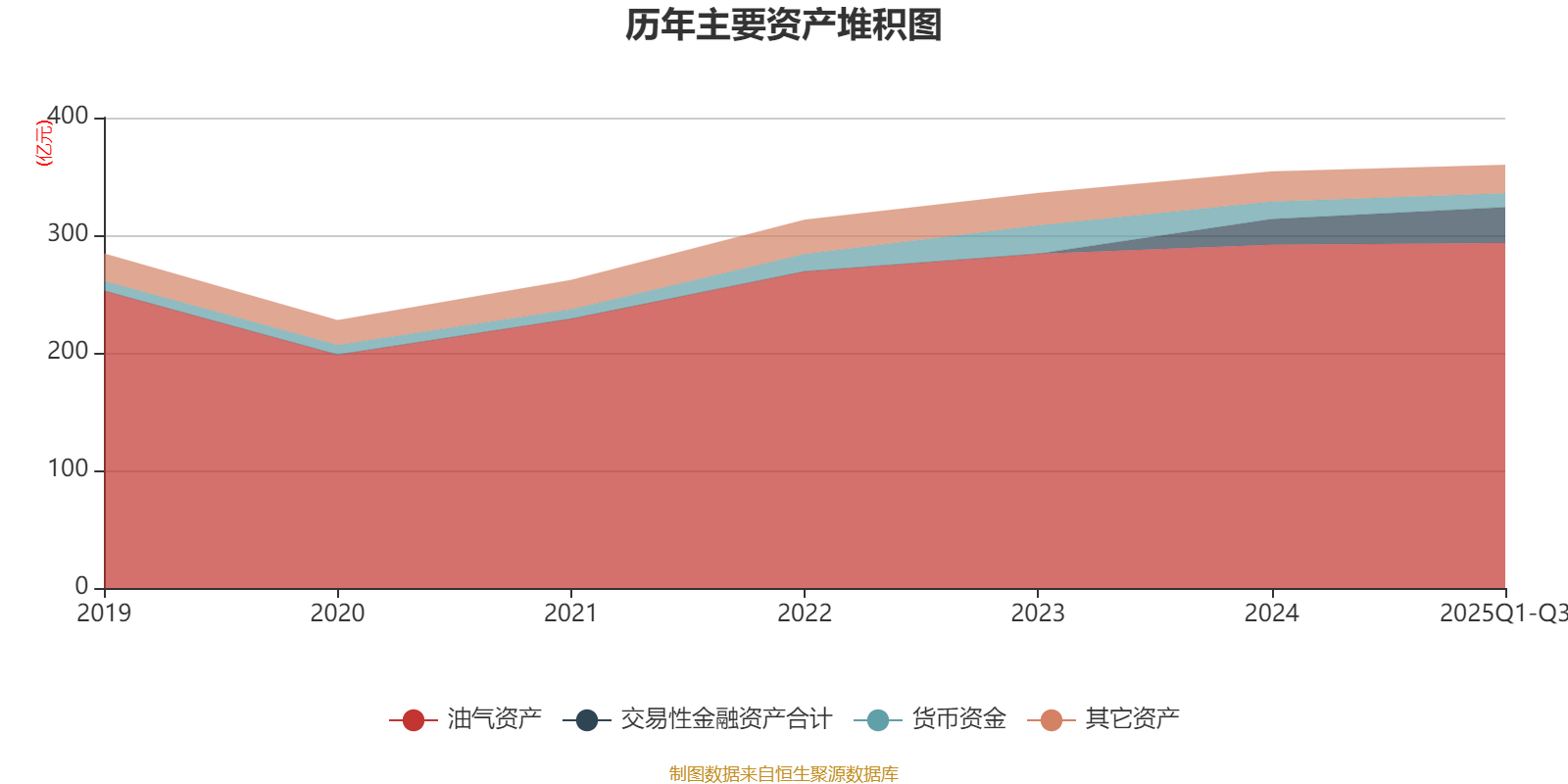 资产重大变化方面,截至2025年三季度末,公司交易性金融资产合计较上年末增加40.14%,占公司总资产比重上升2.34个百分点;货币资金较上年末减少20.73%,占公司总资产比重下降0.92个百分点;应收票据及应收账款较上年末减少31.37%,占公司总资产比重下降0.87个百分点;油气资产较上年末增加0.48%,占公司总资产比重下降0.87个百分点。