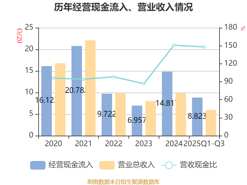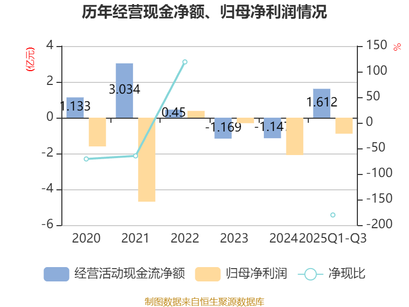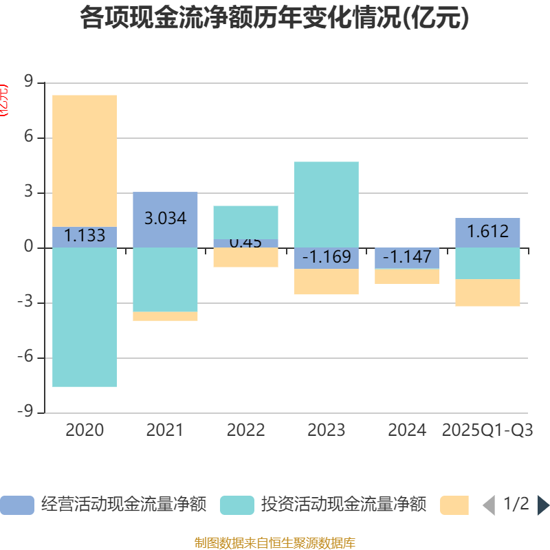2025年前三季度,公司经营活动现金流净额为1.61亿元,同比增加3.84亿元;筹资活动现金流净额-1.47亿元,同比减少7320.42万元;投资活动现金流净额-1.73亿元,上年同期为7565.76万元。