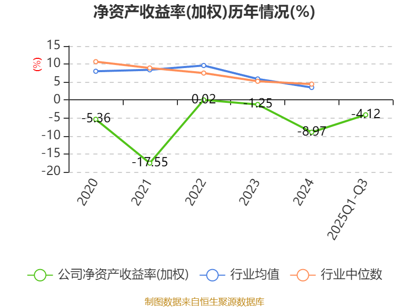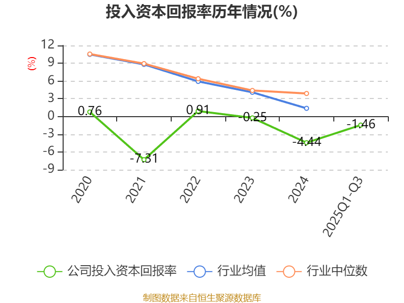 盈利能力方面, 2025年前三季度公司加权平均净资产收益率为-4.12%,同比下降4.36个百分点。公司2025年前三季度投入资本回报率为-1.46%,较上年同期下降2.82个百分点。