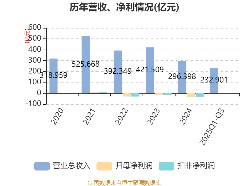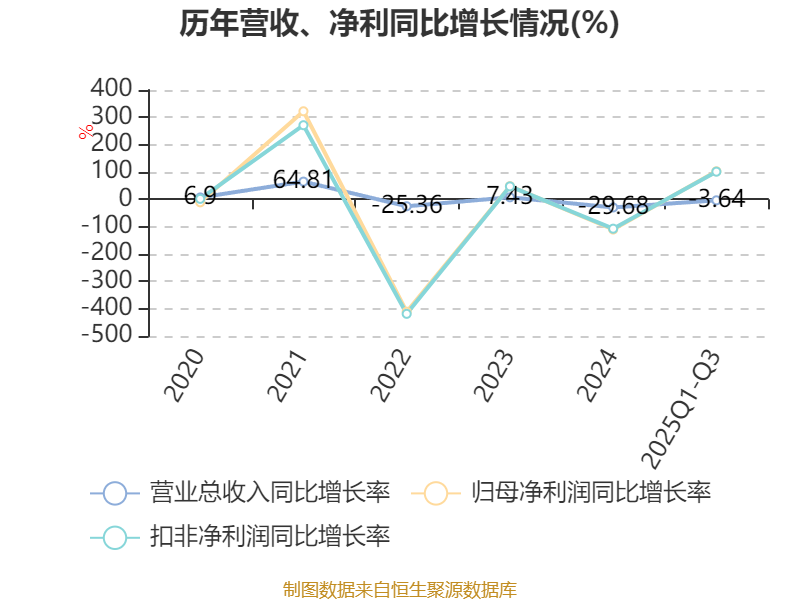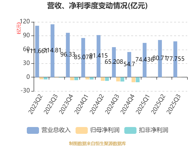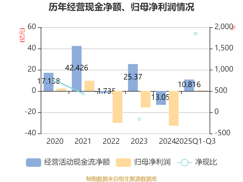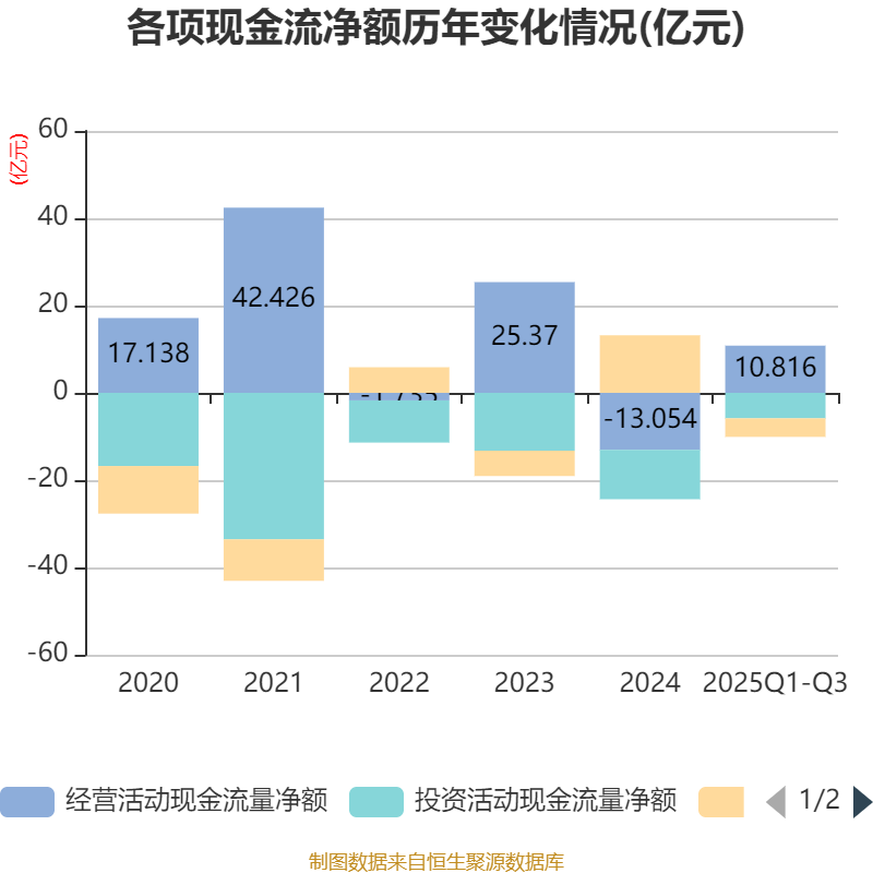 2025年前三季度,公司经营活动现金流净额为10.82亿元,同比增加28.81亿元;筹资活动现金流净额-4.25亿元,同比减少18.89亿元;投资活动现金流净额-5.83亿元,上年同期为-5.97亿元。