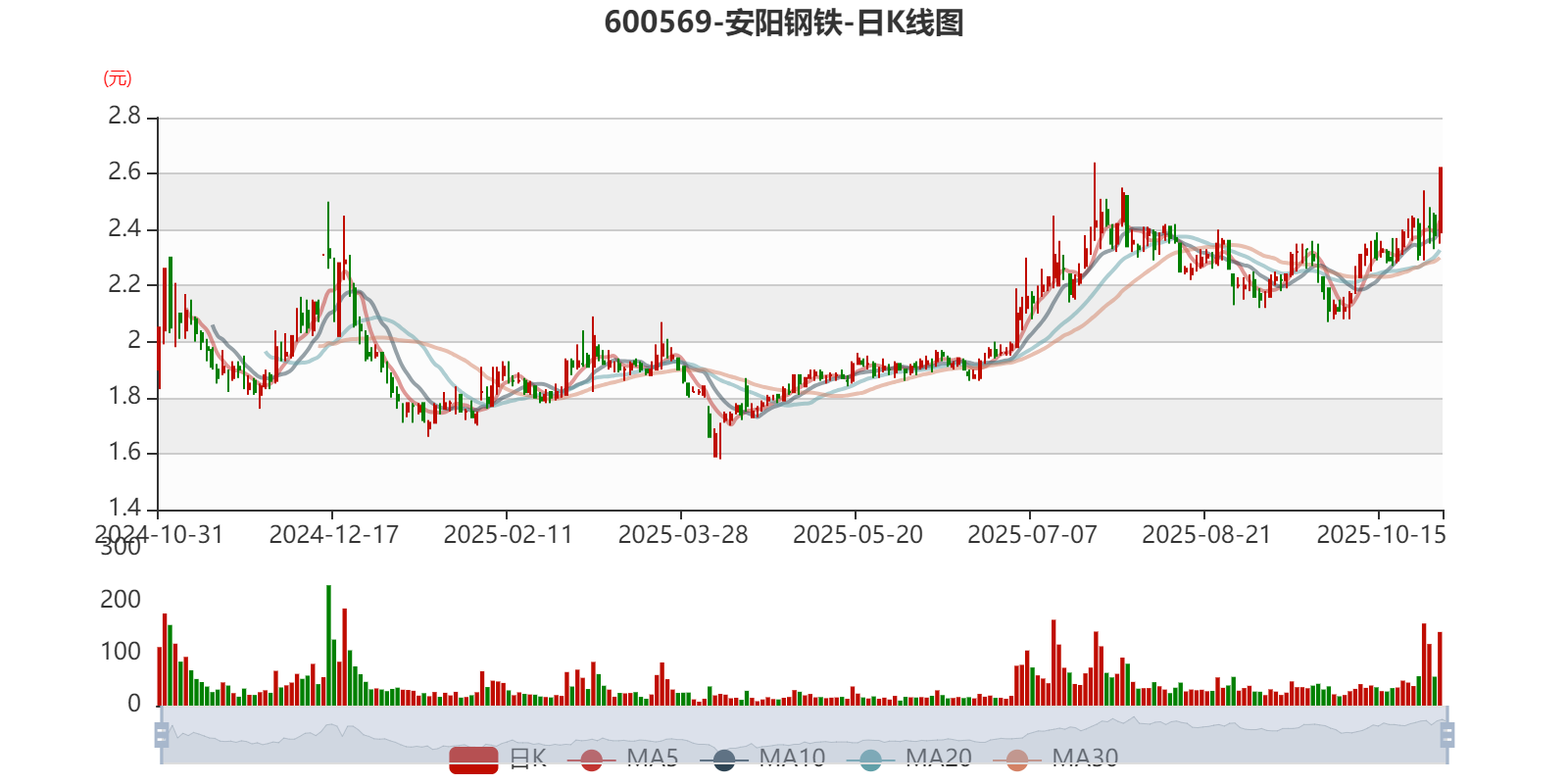 以10月30日收盘价计算,安阳钢铁目前市盈率(TTM)约为-7.26倍,市净率(LF)约2.76倍,市销率(TTM)约0.26倍。
