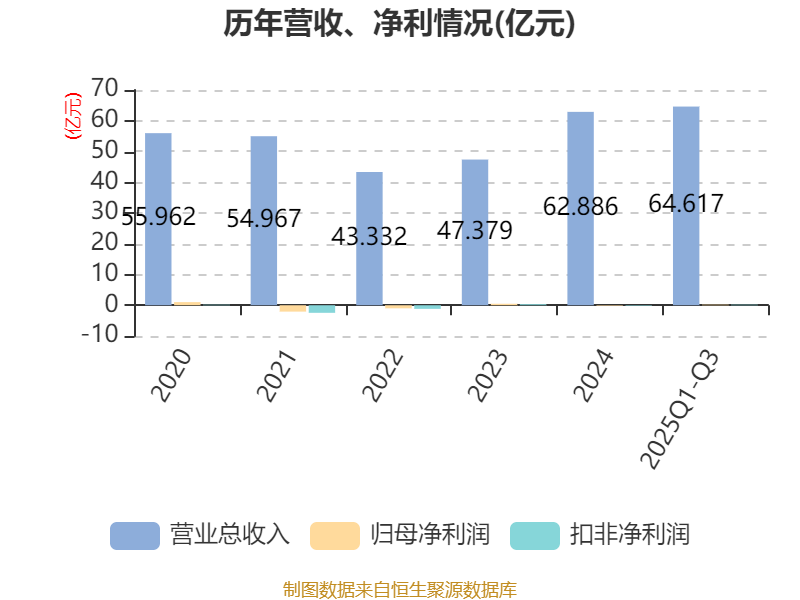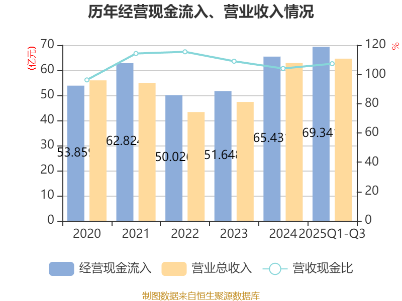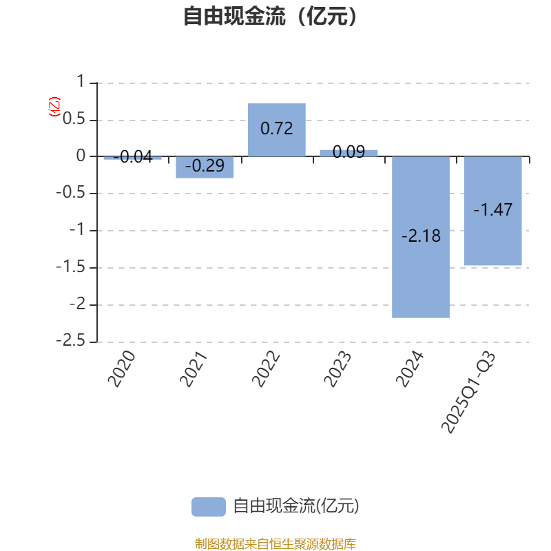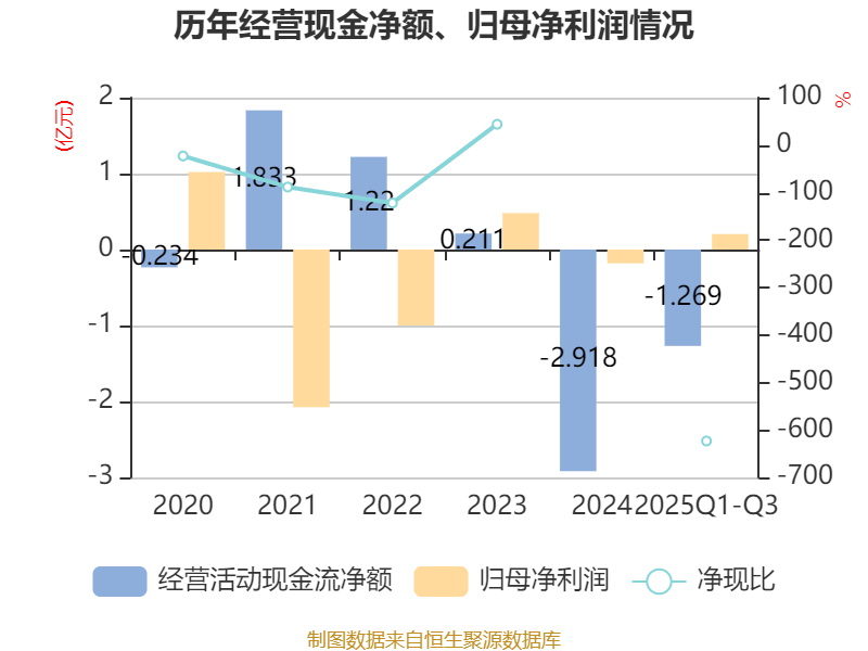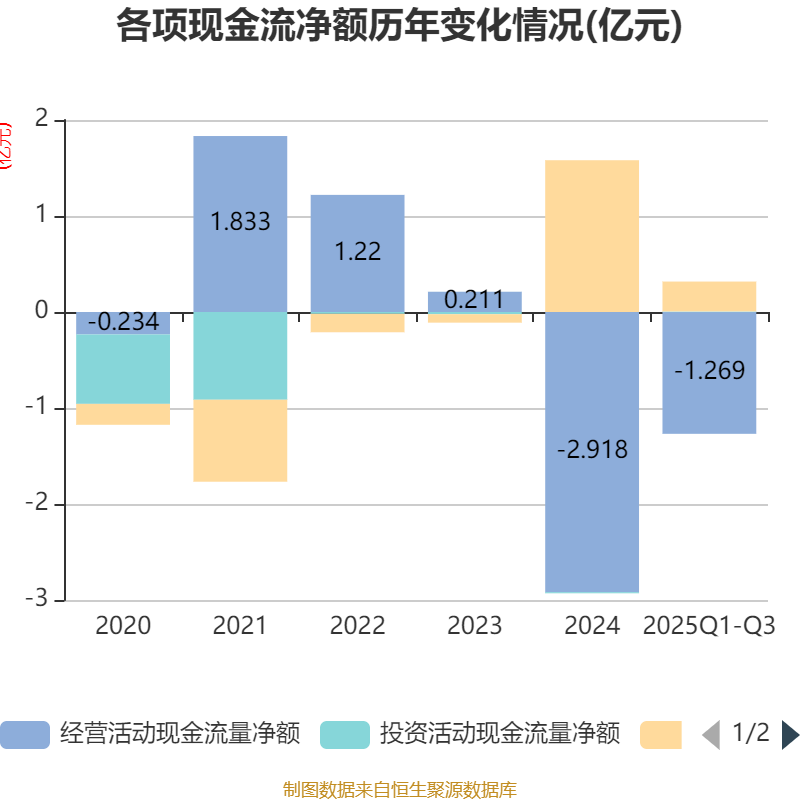 2025年前三季度,公司经营活动现金流净额为-1.27亿元,同比增加1.81亿元;筹资活动现金流净额3110.41万元,同比减少1.35亿元;投资活动现金流净额56.79万元,上年同期为-130.75万元。