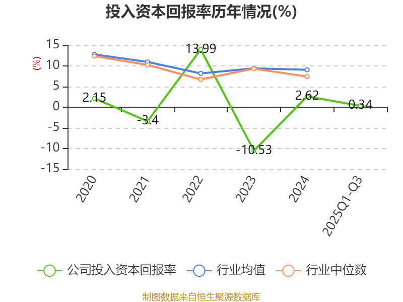 盈利能力方面, 2025年前三季度公司加权平均净资产收益率为-0.41%,同比下降0.91个百分点。公司2025年前三季度投入资本回报率为0.34%,较上年同期下降2.14个百分点。