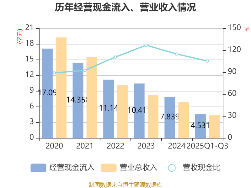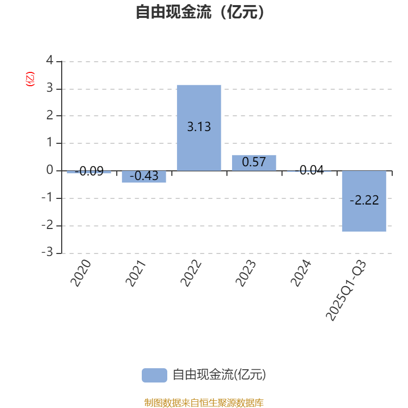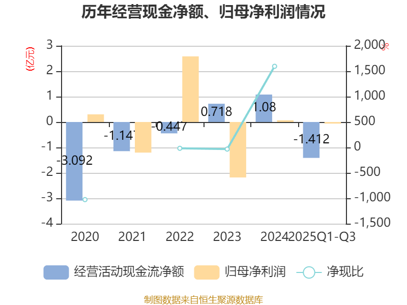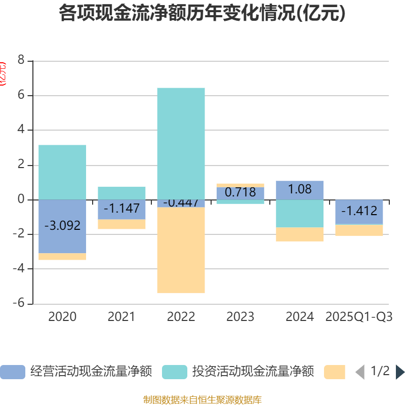 2025年前三季度,公司经营活动现金流净额为-1.41亿元,同比减少2.77亿元;筹资活动现金流净额-6308.25万元,同比减少1700.23万元;投资活动现金流净额-462.45万元,上年同期为-2.68亿元。