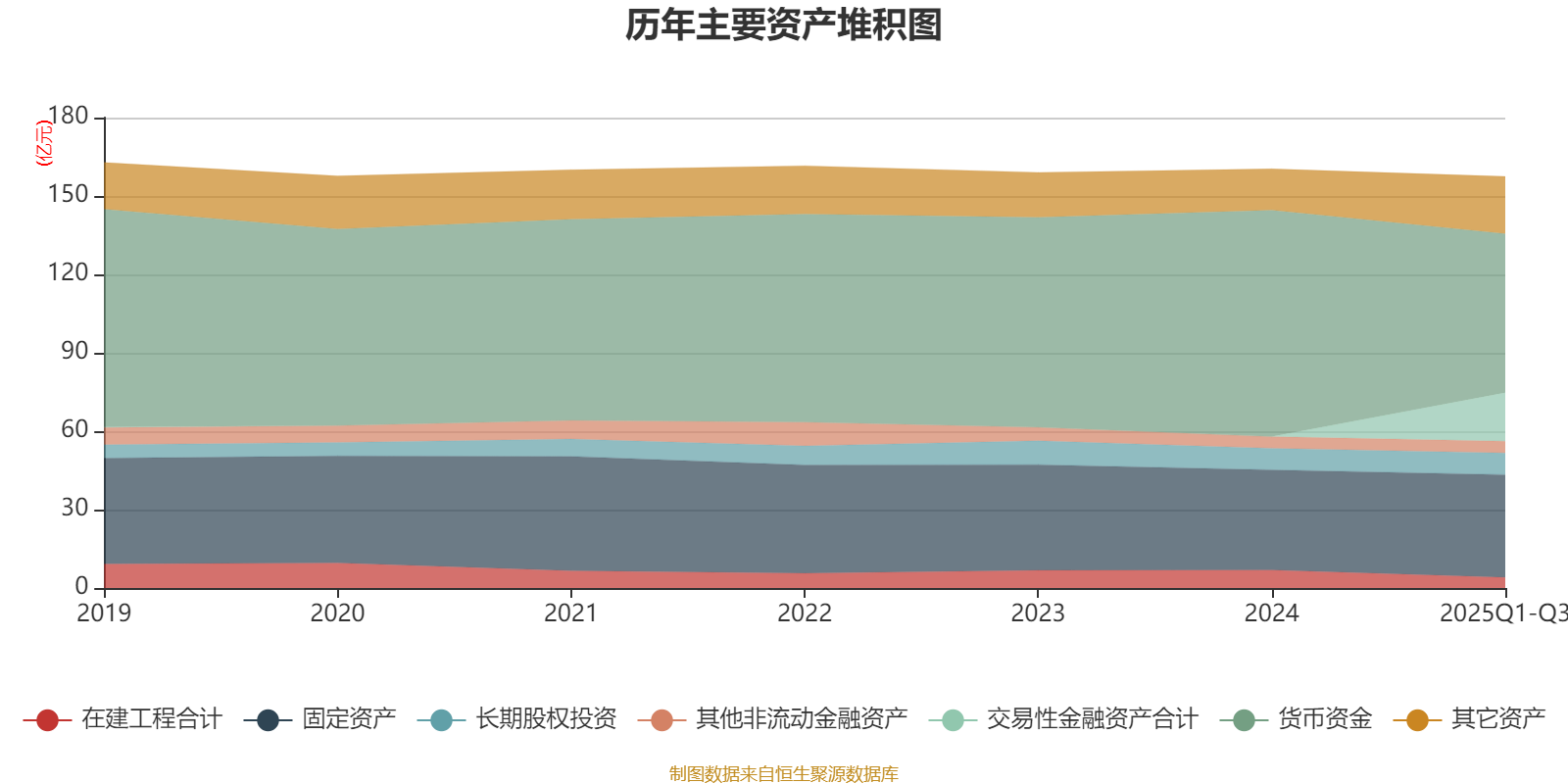 资产重大变化方面,截至2025年三季度末,公司货币资金较上年末减少29.92%,占公司总资产比重下降15.48个百分点;交易性金融资产合计占公司总资产的11.8%,上年末为0;债权投资占公司总资产的3.2%,上年末为0;在建工程合计较上年末减少41.35%,占公司总资产比重下降1.73个百分点。