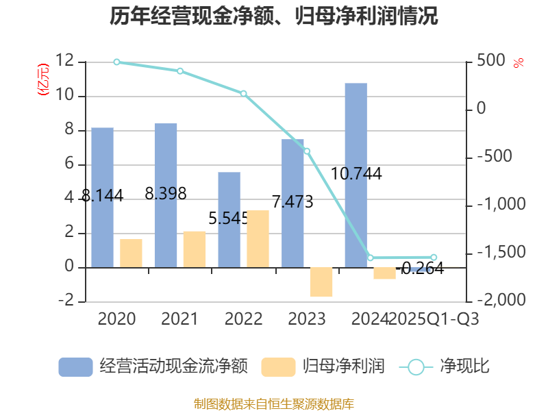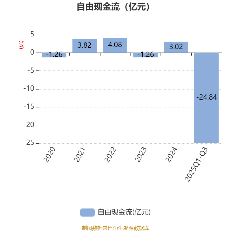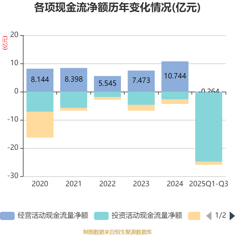 2025年前三季度,公司经营活动现金流净额为-2644.75万元,同比减少3.92亿元;筹资活动现金流净额-1.15亿元,同比减少373.09万元;投资活动现金流净额-24.53亿元,上年同期为-11.97亿元。