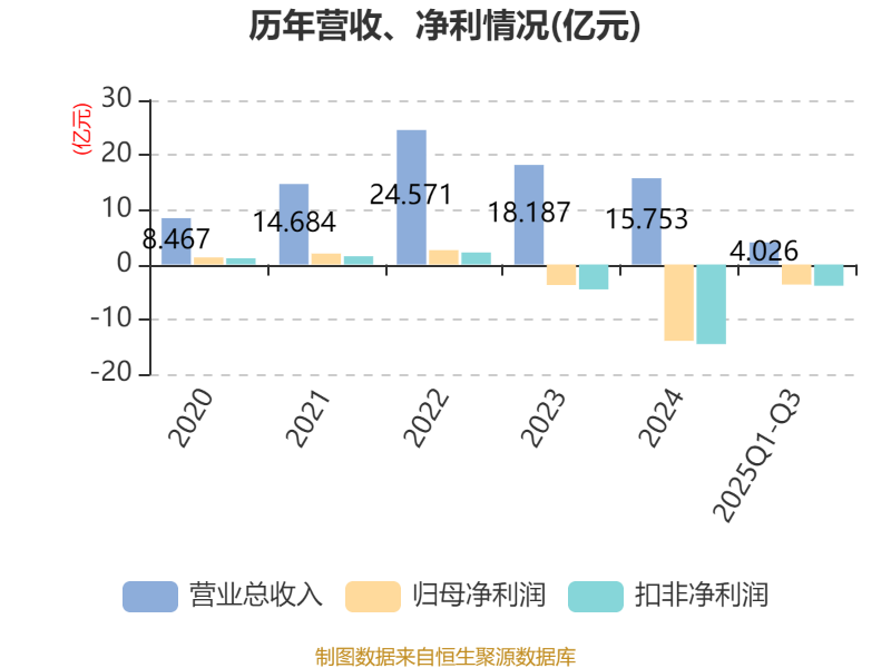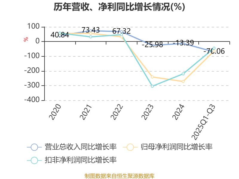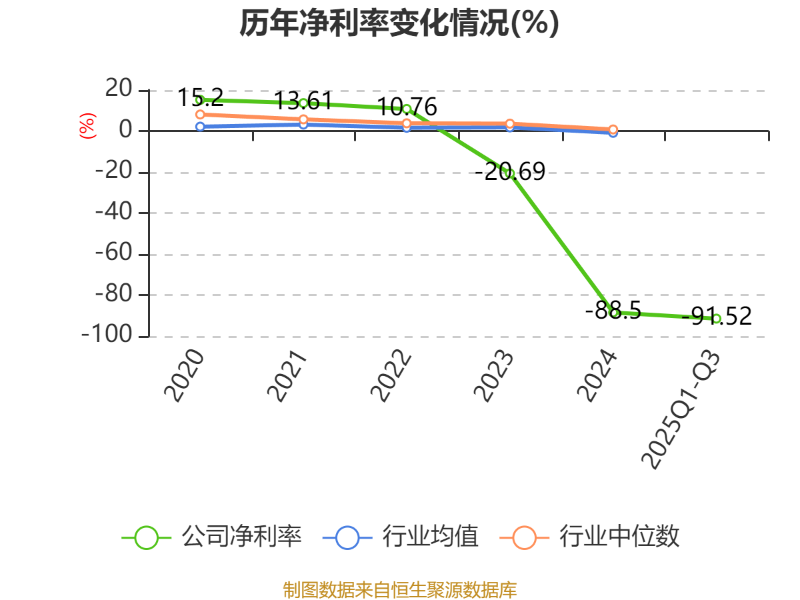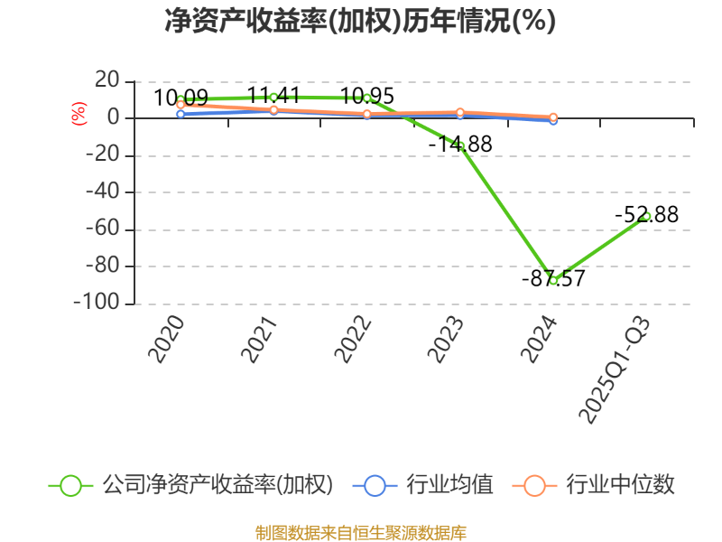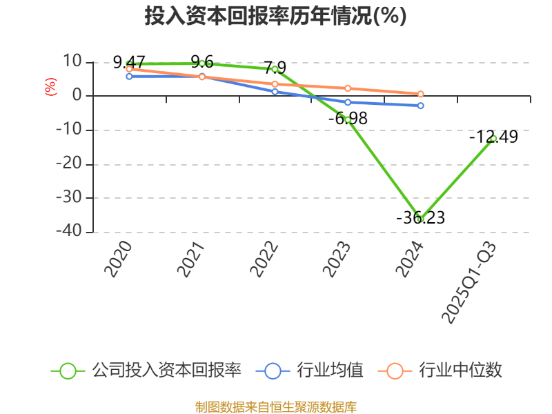 盈利能力方面, 2025年前三季度公司加权平均净资产收益率为-52.88%,同比下降42.69个百分点。公司2025年前三季度投入资本回报率为-12.49%,较上年同期下降9.36个百分点。