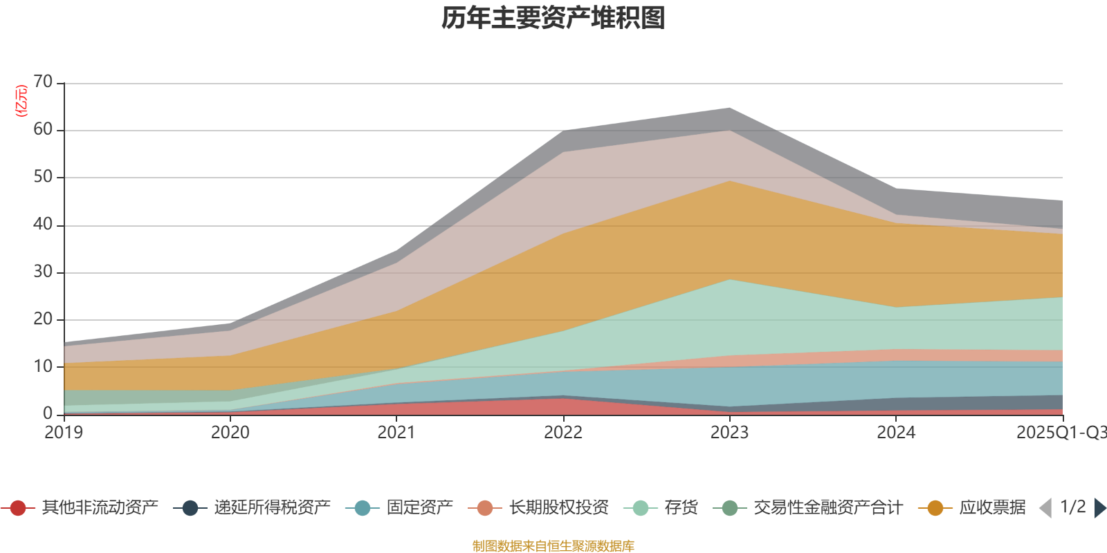 资产重大变化方面,截至2025年三季度末,公司应收票据及应收账款较上年末减少24.98%,占公司总资产比重下降7.69个百分点;存货较上年末增加26.54%,占公司总资产比重上升6.26个百分点;其他应收款(含利息和股利)较上年末增加93.71%,占公司总资产比重上升1.75个百分点;货币资金较上年末减少39.9%,占公司总资产比重下降1.37个百分点。