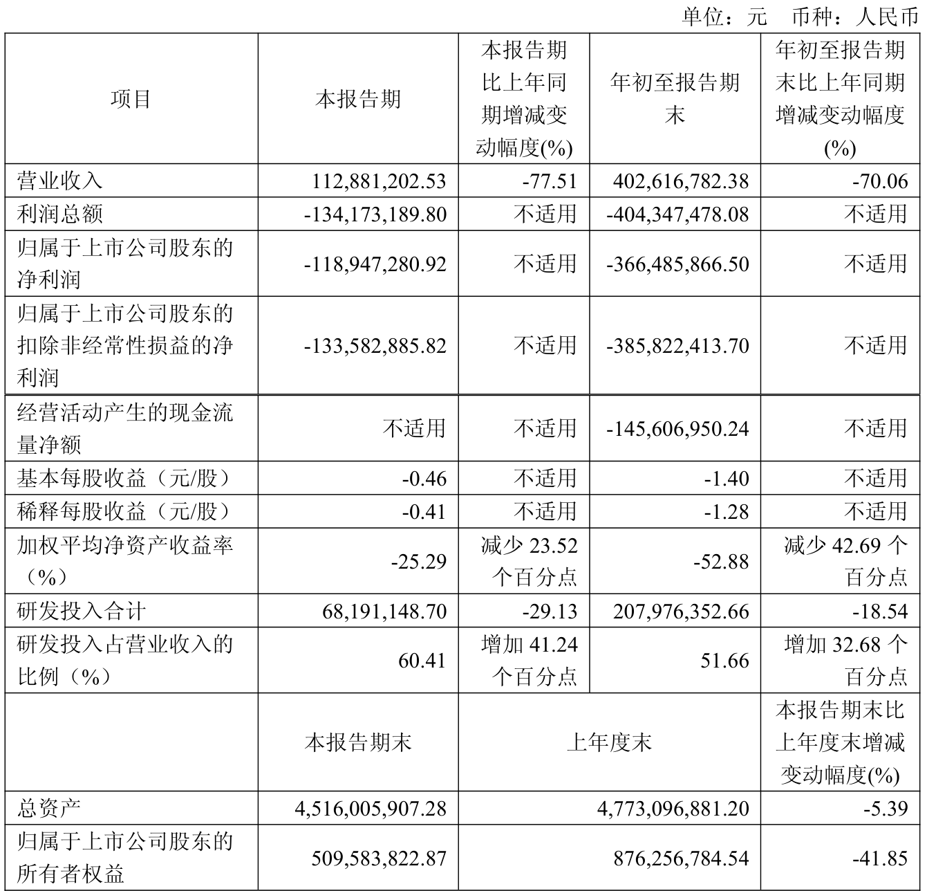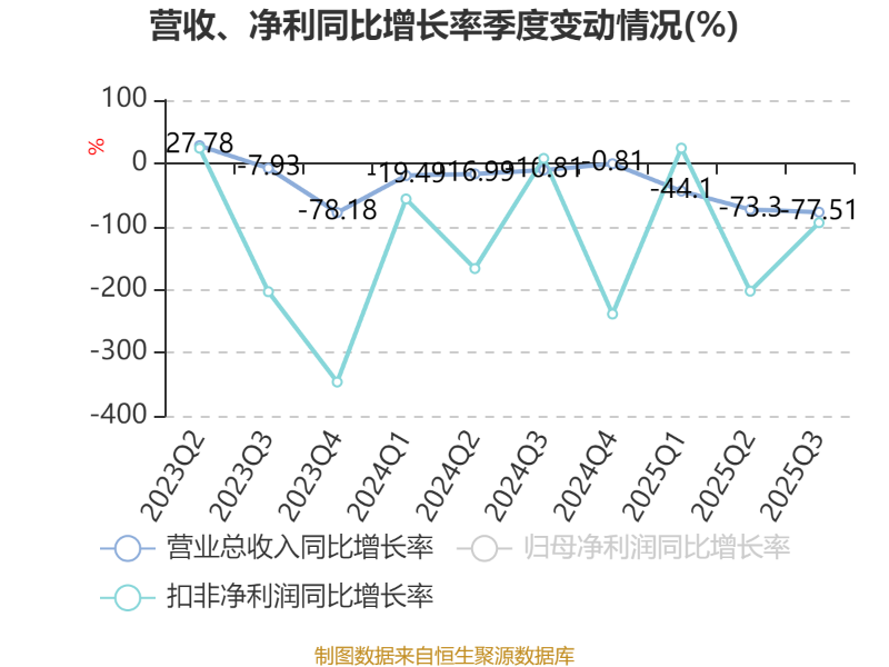 中证智能财讯航天宏图(688066)10月31日披露2025年第三季度报告。前三季度公司实现营业总收入4.03亿元,同比下降70.06%;归母净利润亏损3.66亿元,上年同期亏损2.22亿元;扣非净利润亏损3.86亿元,上年同期亏损2.66亿元;经营活动产生的现金流量净额为-1.46亿元,上年同期为-4.06亿元;报告期内,航天宏图基本每股收益为-1.4元,加权平均净资产收益率为-52.88%。