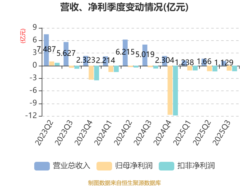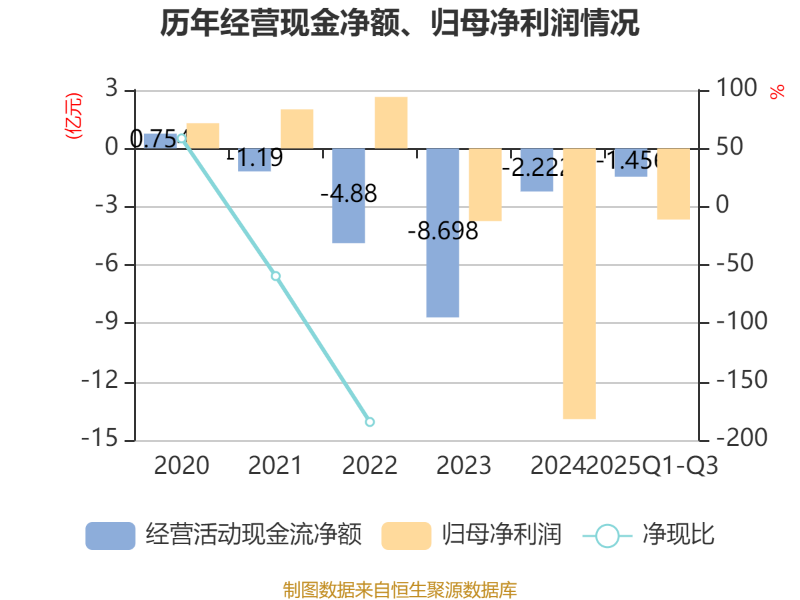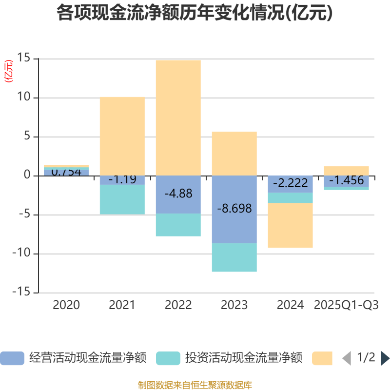 2025年前三季度,公司经营活动现金流净额为-1.46亿元,同比增加2.6亿元;筹资活动现金流净额1.19亿元,同比增加4.74亿元;投资活动现金流净额-4026.01万元,上年同期为-8531.39万元。