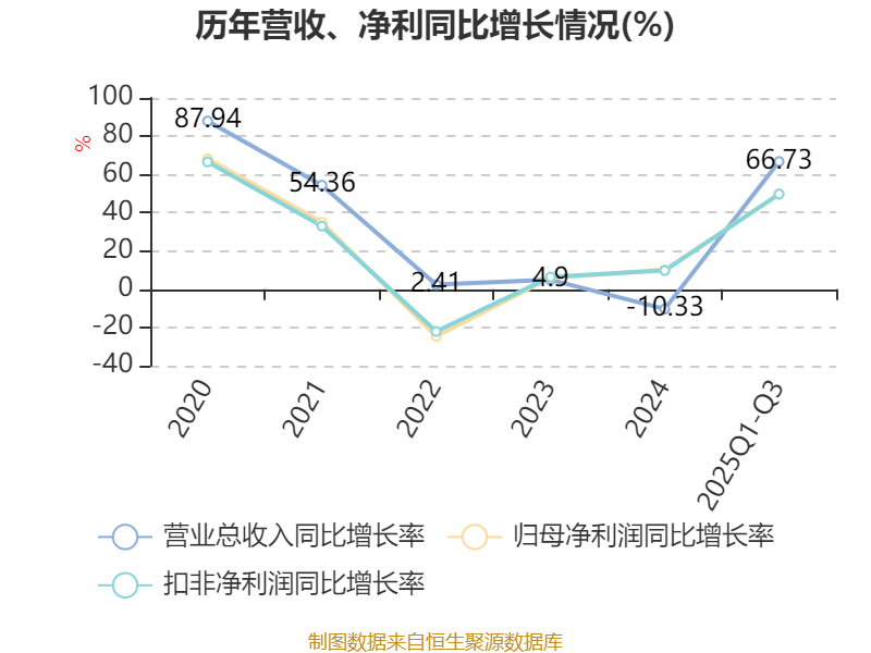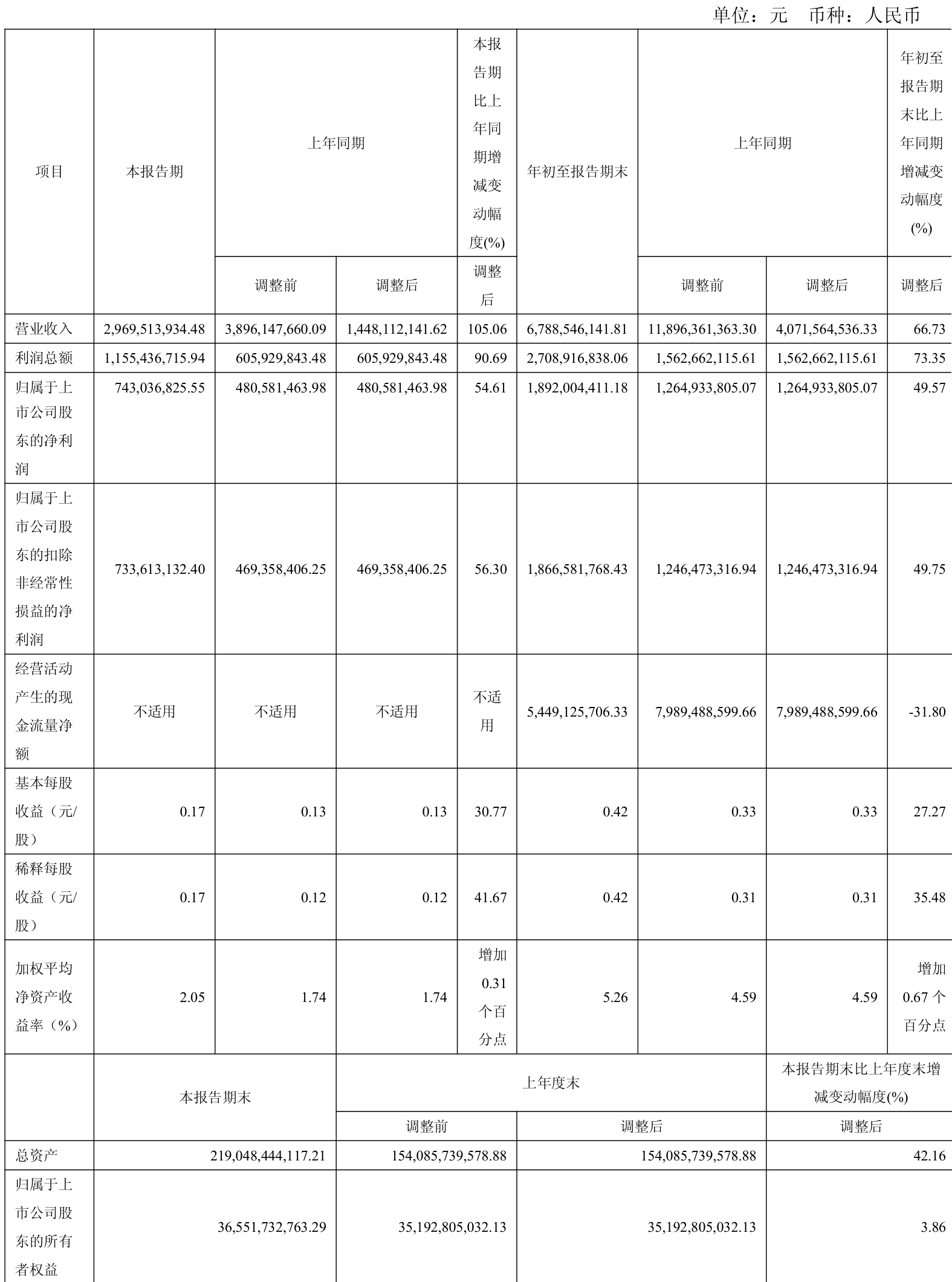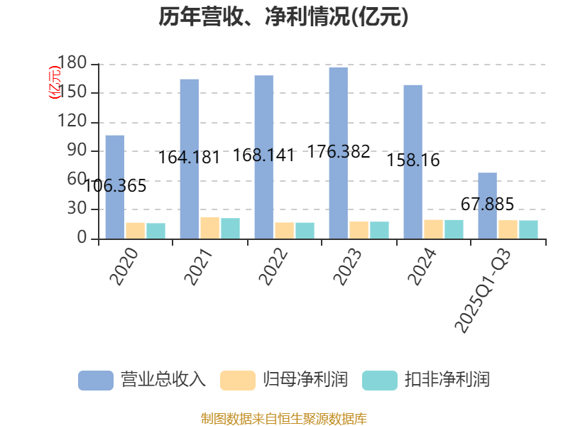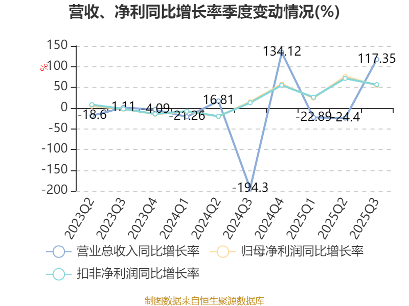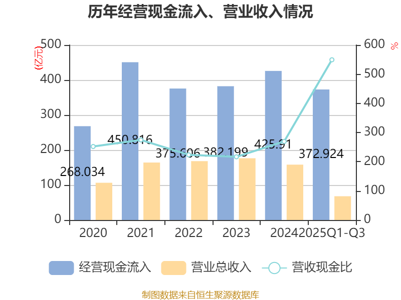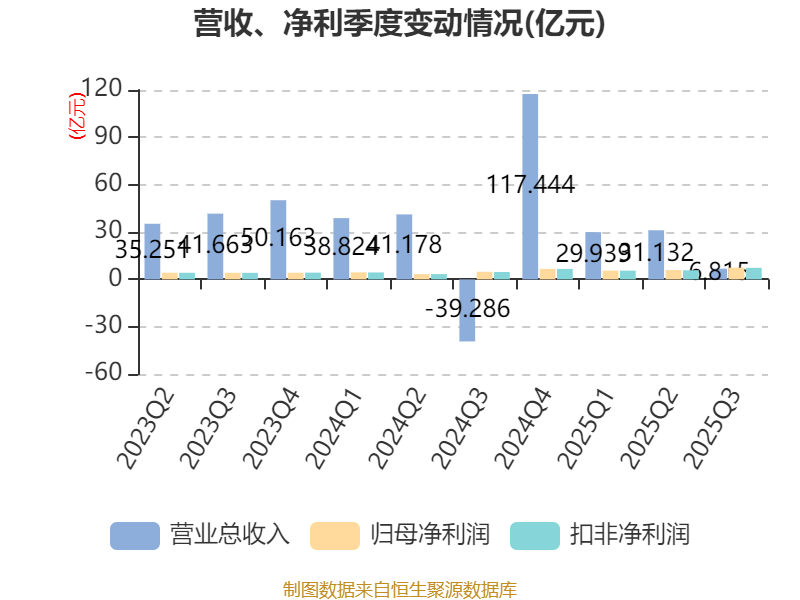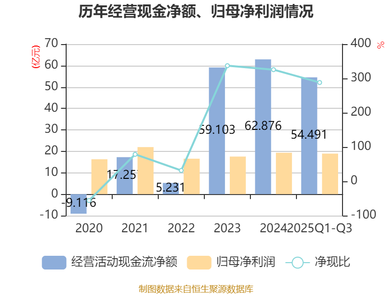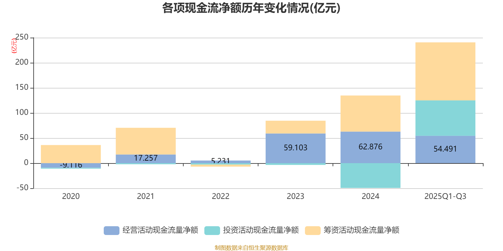 2025年前三季度,公司经营活动现金流净额为54.49亿元,同比下降31.8%;筹资活动现金流净额115.53亿元,同比增加127.95亿元;投资活动现金流净额70.6亿元,上年同期为-19.45亿元。