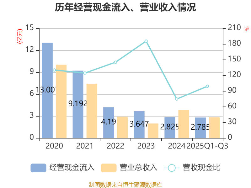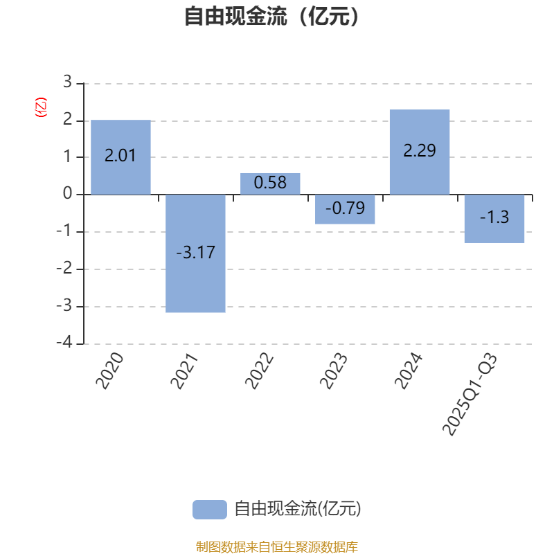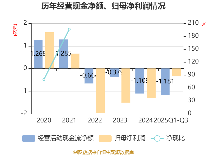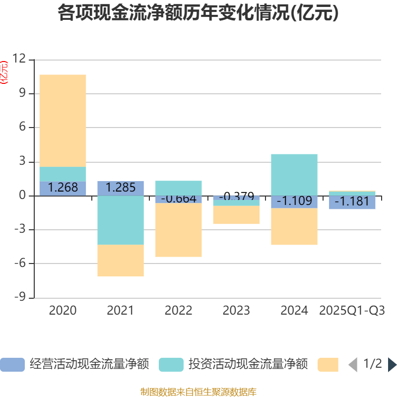 2025年前三季度,公司经营活动现金流净额为-1.18亿元,同比减少5399.6万元;筹资活动现金流净额700.74万元,同比增加3.21亿元;投资活动现金流净额3656.94万元,上年同期为1.85亿元。