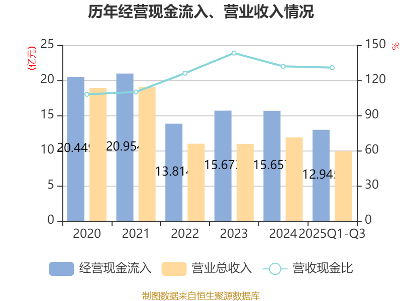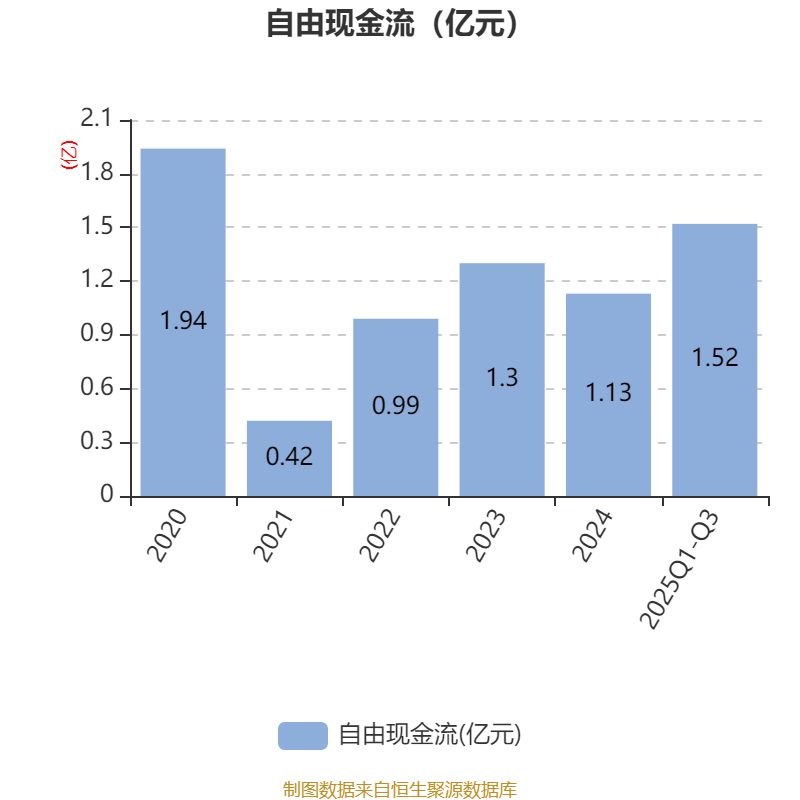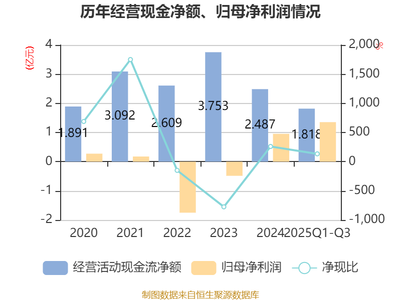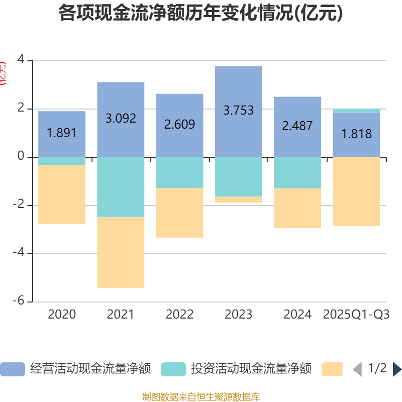 2025年前三季度,公司经营活动现金流净额为1.82亿元,同比增长17.24%;筹资活动现金流净额-2.88亿元,同比减少1.07亿元;投资活动现金流净额1653.57万元,上年同期为-1.34亿元。