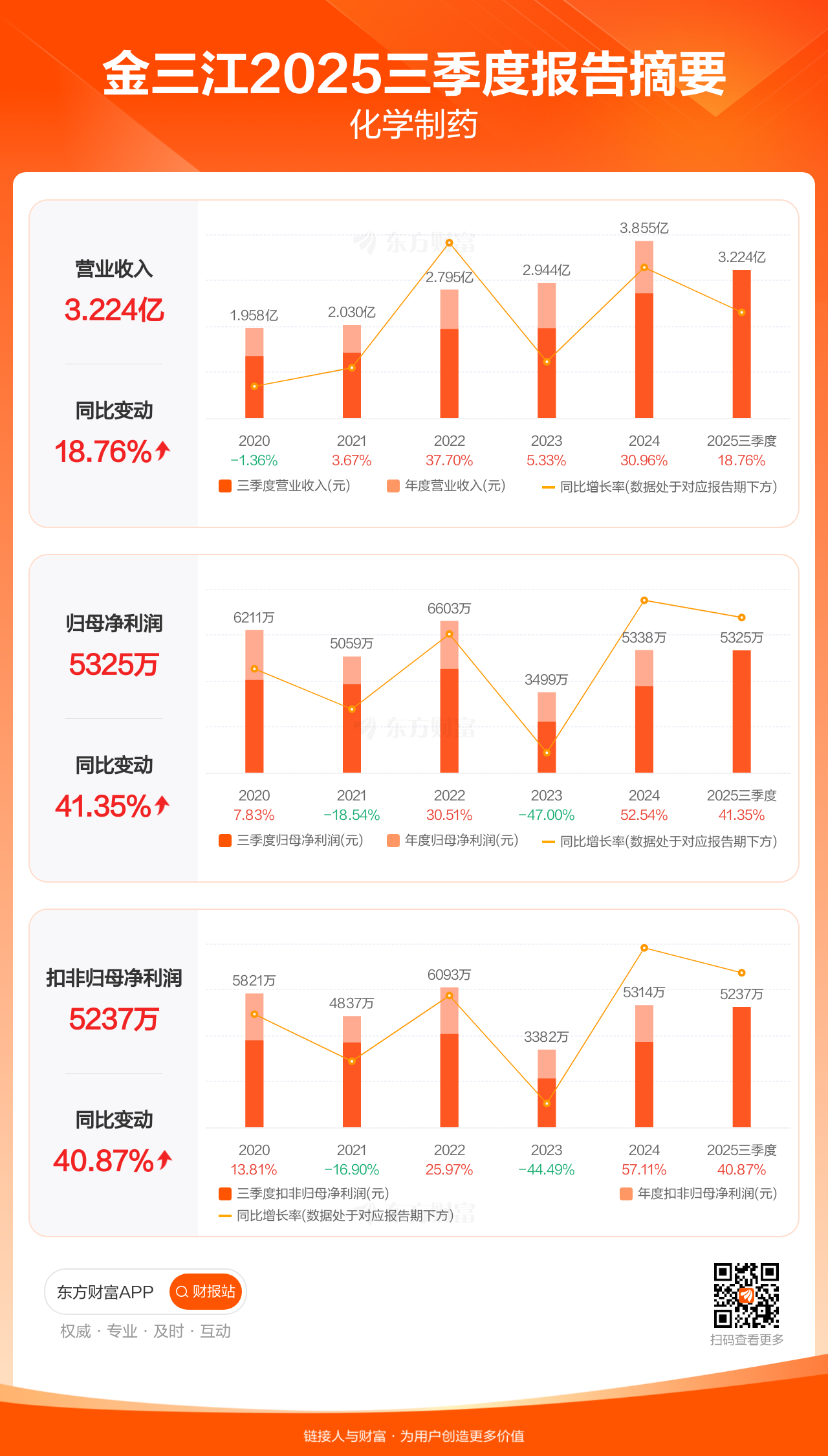 金三江10月31日发布2025年三季报显示,公司前三季实现营业收入3.22亿元,同比增长18.76%;归母净利润5325.37万元,同比增长41.35%;扣非归母净利润5236.86万元,同比增长40.87%。