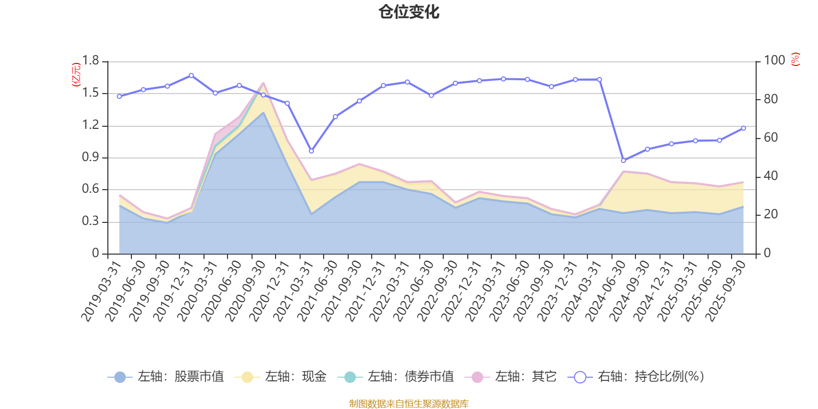 据定期报告数据统计,近三年平均股票仓位为73.54%,同类平均为72.35%。2019年末基金达到92.65%的最高仓位,2024年上半年末最低,为48.5%。