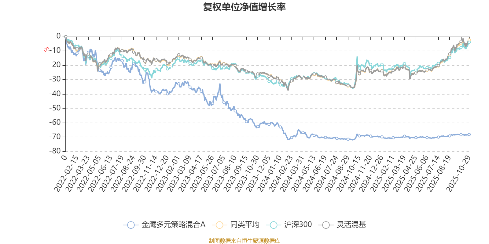 截至10月29日,金鹰多元策略混合A近三个月复权单位净值增长率为3.38%,位于同类可比基金1012/1287;近半年复权单位净值增长率为8.02%,位于同类可比基金1070/1287;近一年复权单位净值增长率为2.87%,位于同类可比基金1215/1287;近三年复权单位净值增长率为-48.23%,位于同类可比基金1284/1286。