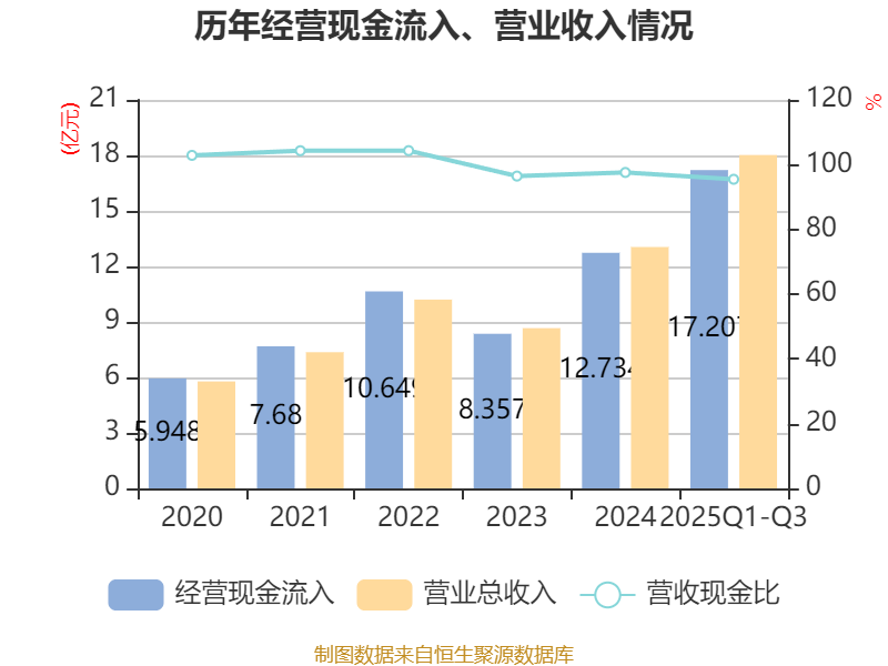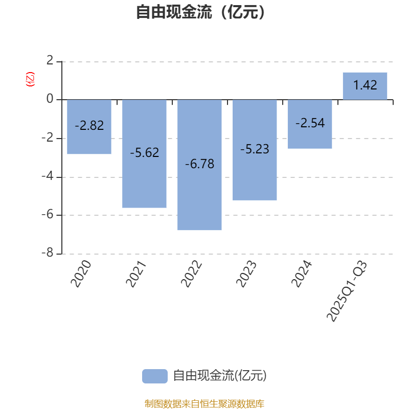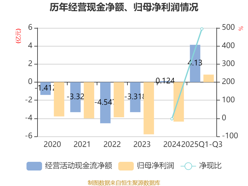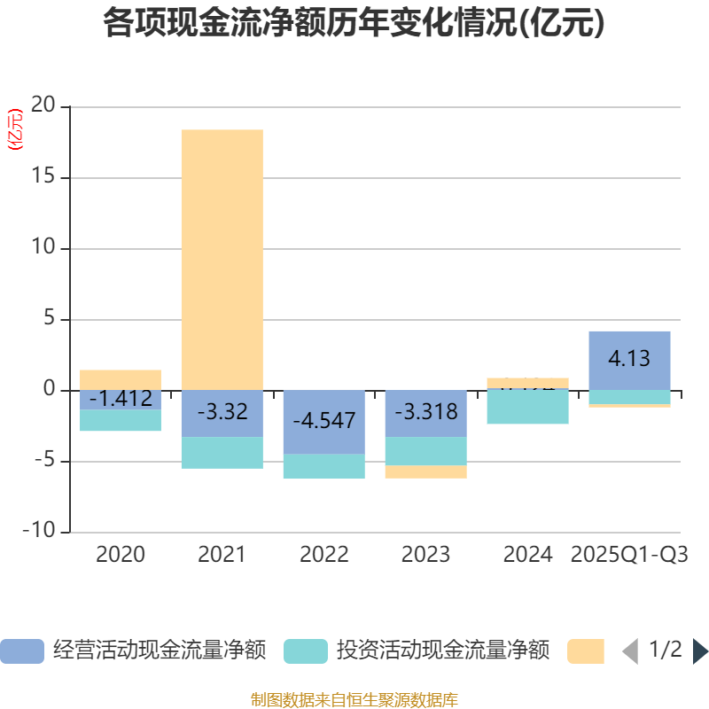 2025年前三季度,公司经营活动现金流净额为4.13亿元,同比增长3228.49%;筹资活动现金流净额-2156.42万元,同比减少6848.17万元;投资活动现金流净额-1.02亿元,上年同期为-2.28亿元。