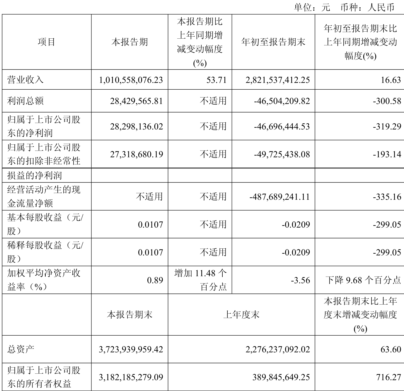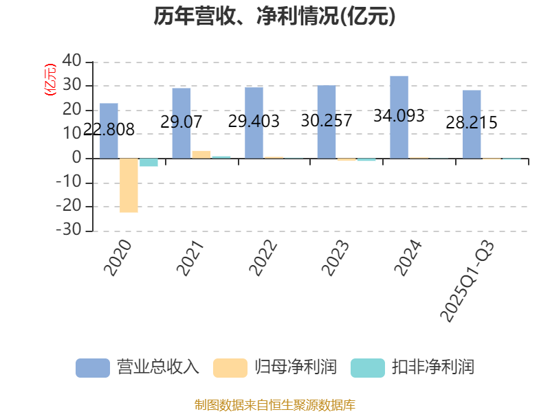 中证智能财讯宏达股份(600331)10月31日披露2025年第三季度报告。前三季度公司实现营业总收入28.22亿元,同比增长16.63%;归母净利润亏损4669.64万元,上年同期盈利2129.42万元;扣非净利润亏损4972.54万元,上年同期盈利5339.05万元;经营活动产生的现金流量净额为-4.88亿元,上年同期为2.07亿元;报告期内,宏达股份基本每股收益为-0.0209元,加权平均净资产收益率为-3.56%。