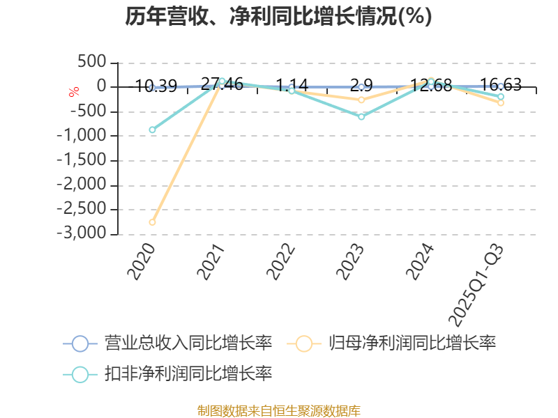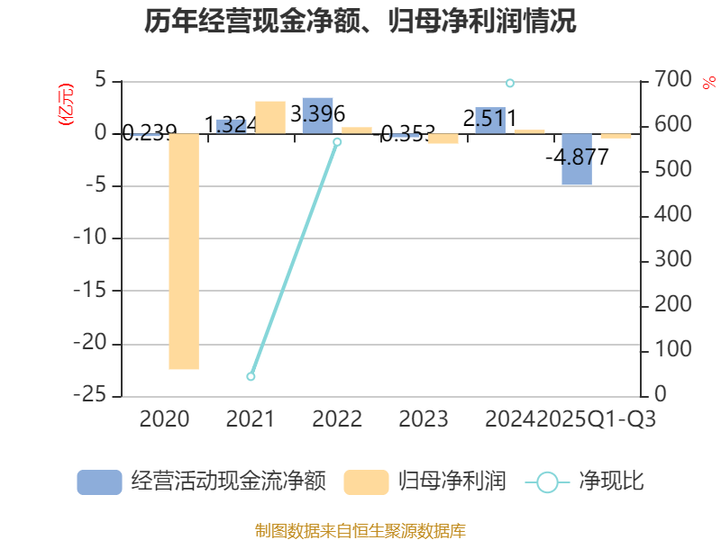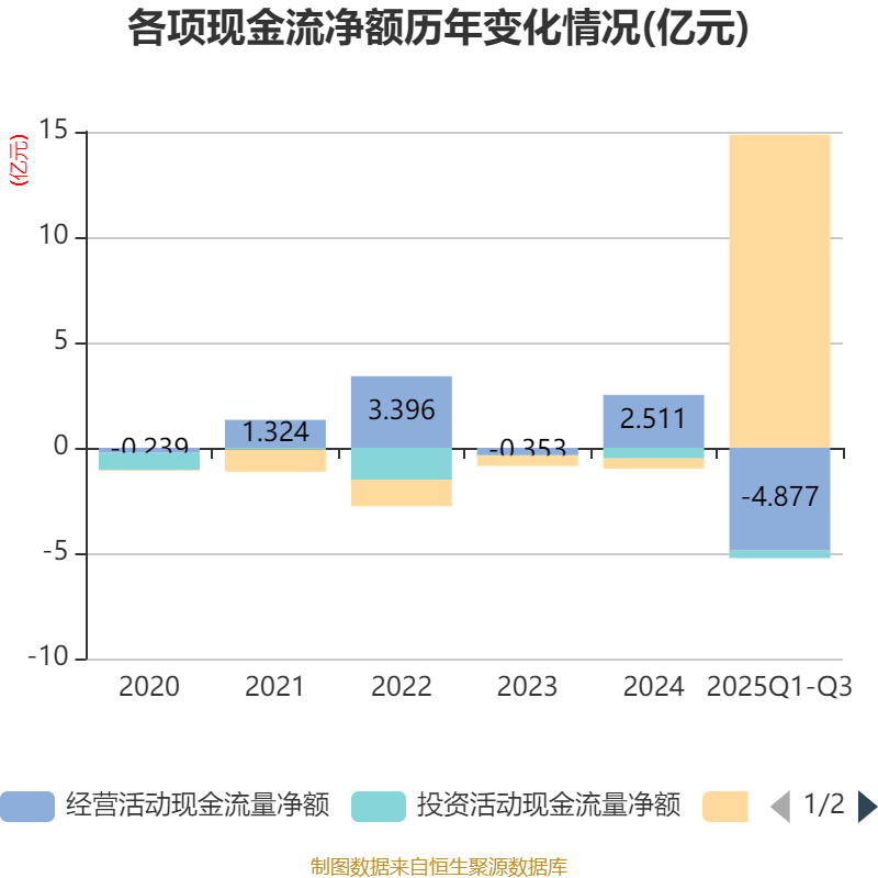 2025年前三季度,公司经营活动现金流净额为-4.88亿元,同比减少6.95亿元;筹资活动现金流净额14.86亿元,同比增加15.12亿元;投资活动现金流净额-3591.91万元,上年同期为-7073.11万元。
