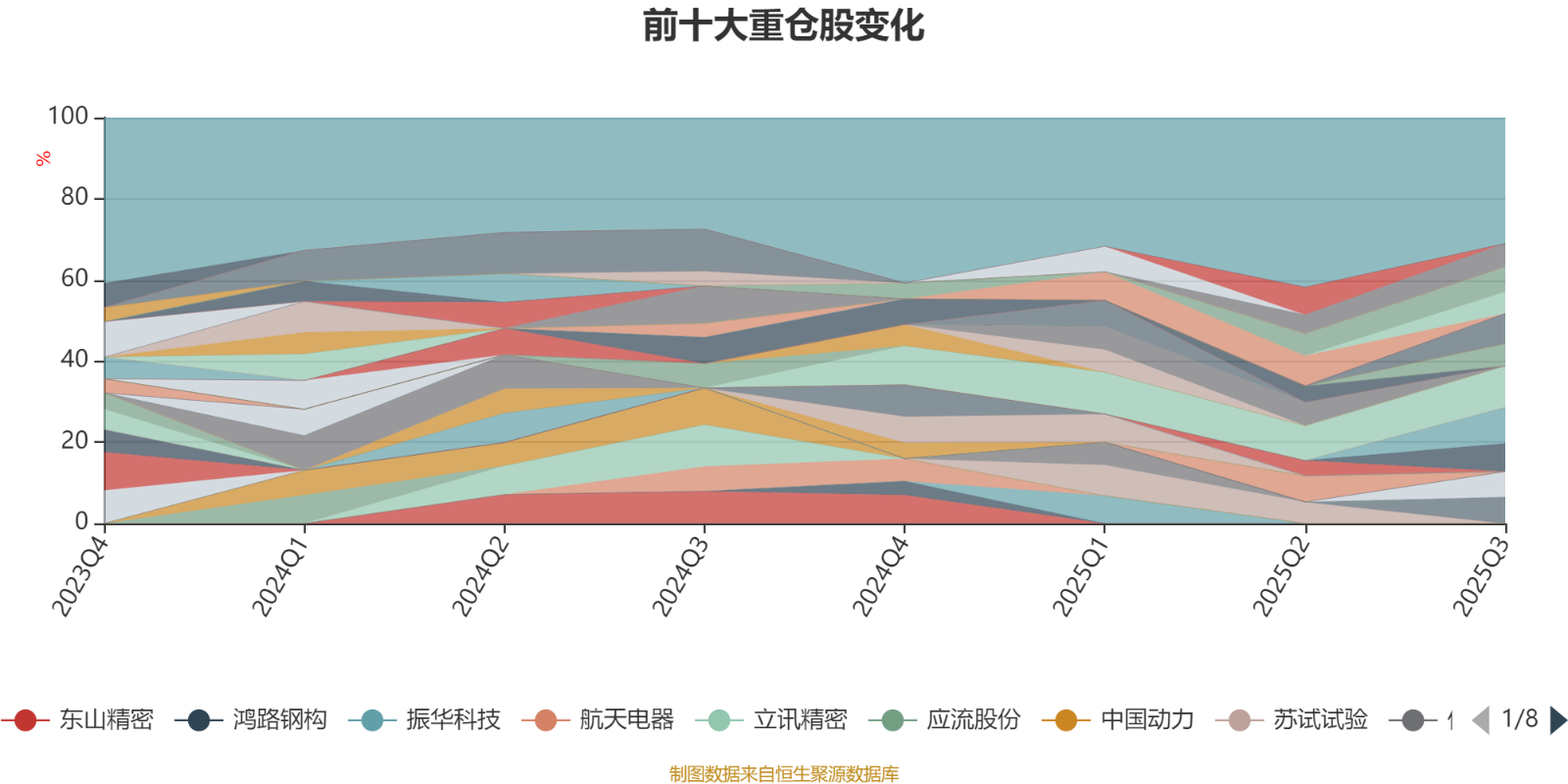 该基金持股集中度较高。截至2025年三季度末,基金十大重仓股分别是新雷能、寒武纪、工业富联、生益科技、华虹公司、中际旭创、蓝思科技、上海沿浦、浙江荣泰、新易盛。