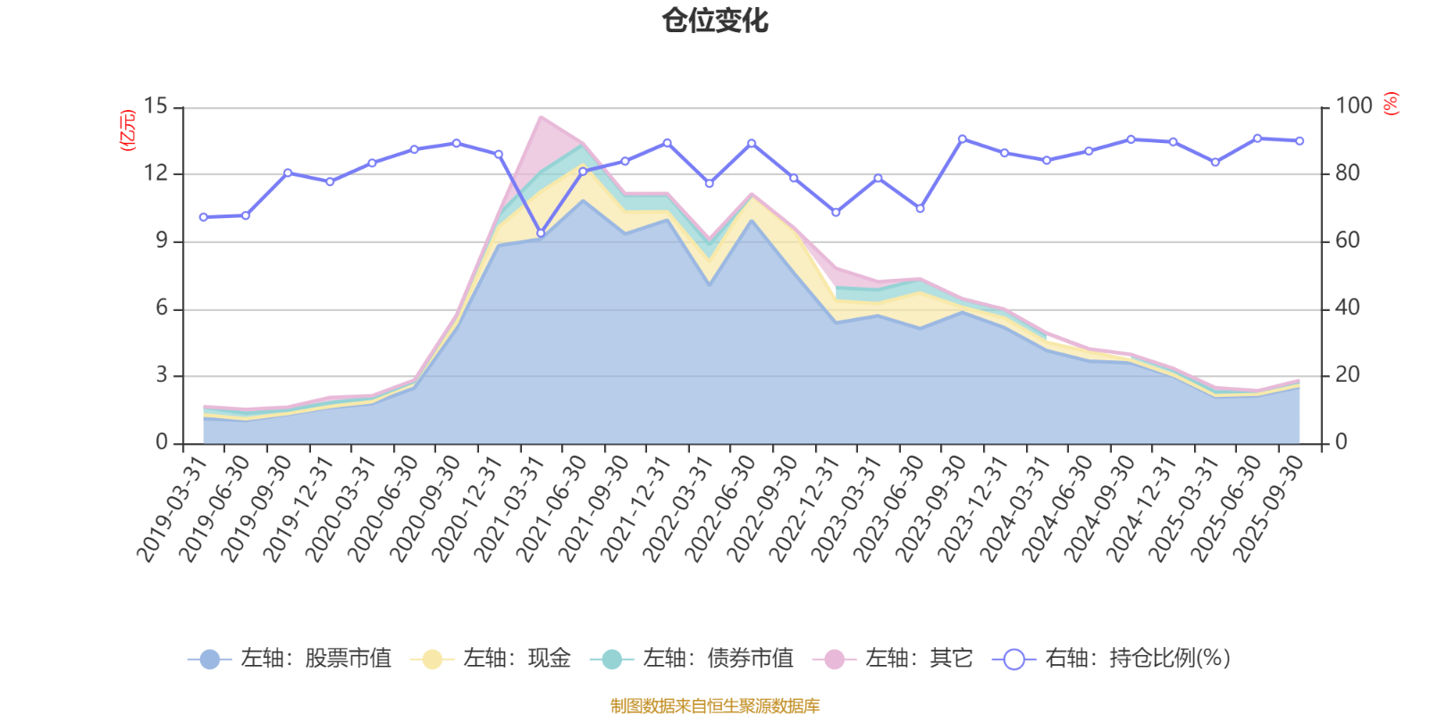 据定期报告数据统计,近三年平均股票仓位为84.21%,同类平均为72.35%。2025年上半年末基金达到90.77%的最高仓位,2021年一季度末最低,为62.59%。