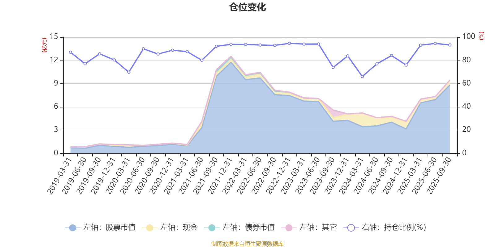 据定期报告数据统计,近三年平均股票仓位为85.33%,同类平均为72.35%。2022年末基金达到94.56%的最高仓位,2024年一季度末最低,为66.05%。