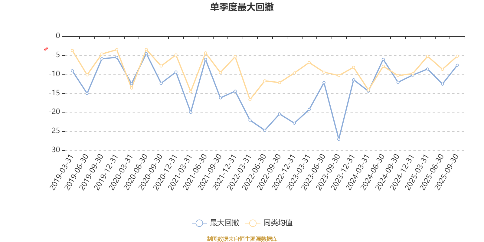 通过所选区间该基金净值增长率分位图,可以观察该基金与同类基金业绩比较情况。图为坐标原点到区间内某时点的净值增长率在同类基金中的分位数。