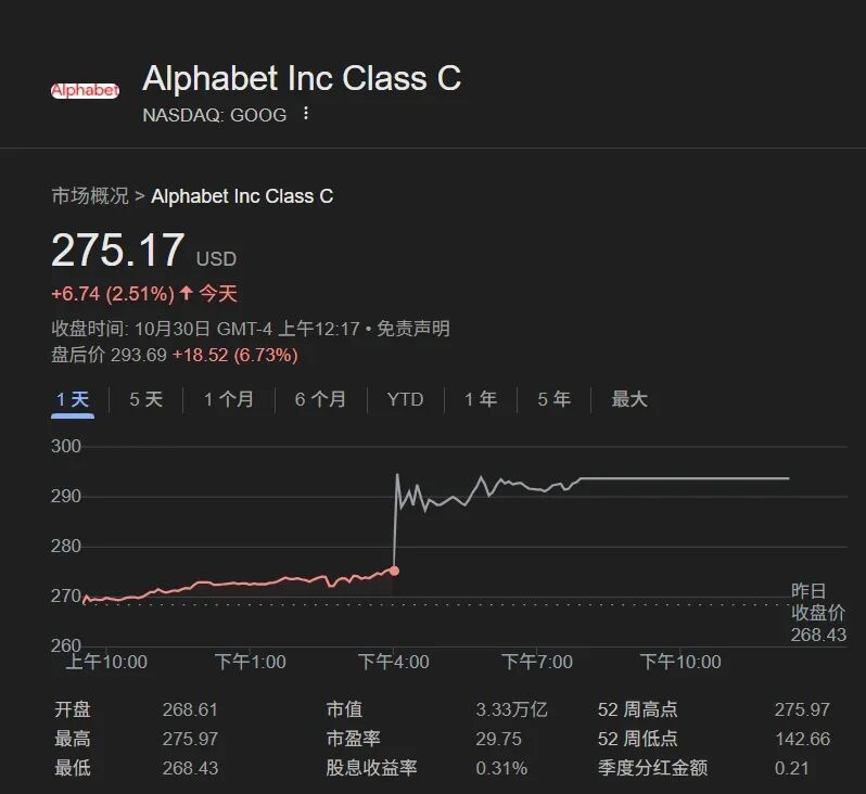 29日,Alphabet最新财报显示,三季度营收首次突破1000亿美元大关,达到1023亿美元,同比飙升16%;净利润同比增长33%至约350亿美元。云业务收入达到152亿美元,同比增长34%,成为增长最快板块之一。财报公布后,Alphabet股价盘后一度上涨7.7%。