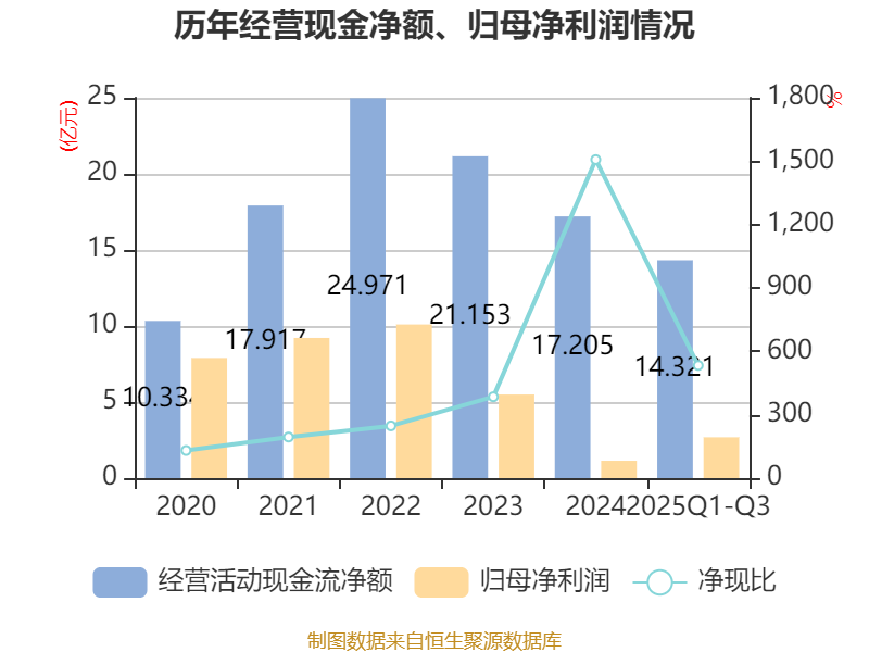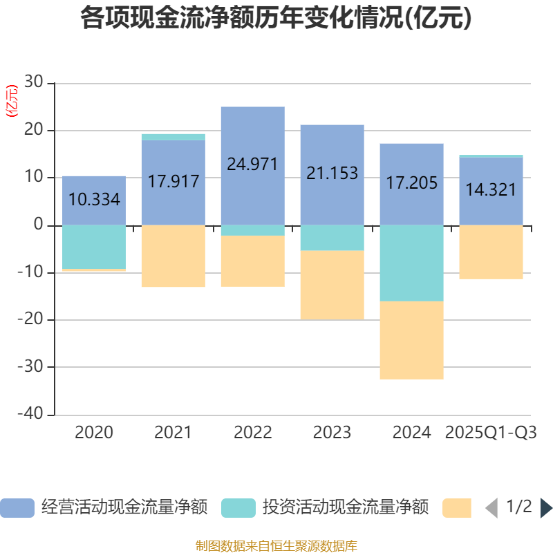 2025年前三季度,公司经营活动现金流净额为14.32亿元,同比增长15.42%;筹资活动现金流净额-11.4亿元,同比增加1.69亿元;投资活动现金流净额5055.13万元,上年同期为-3.78亿元。