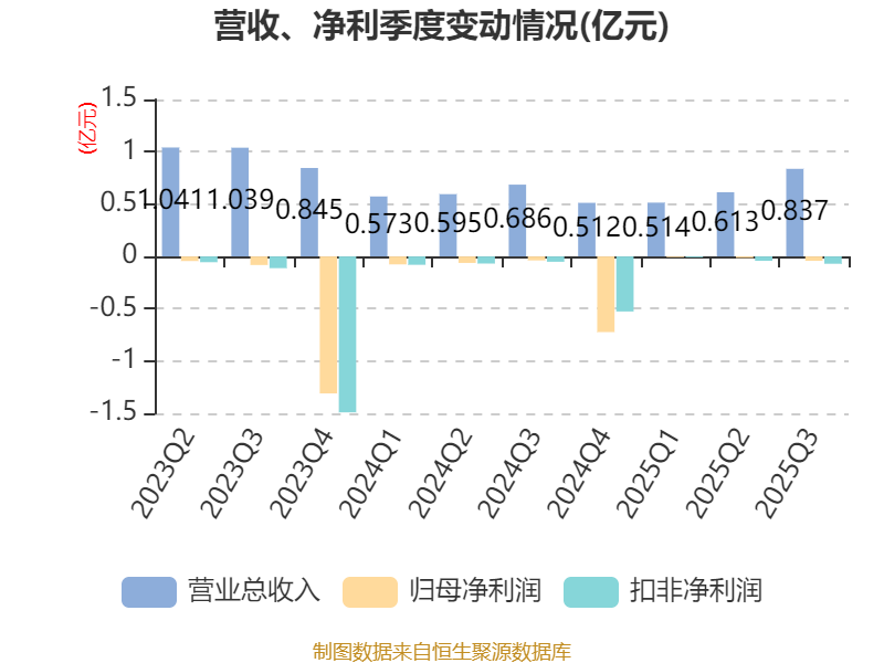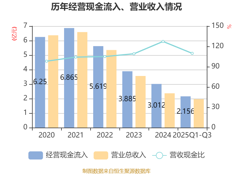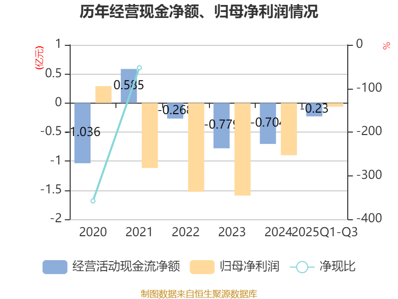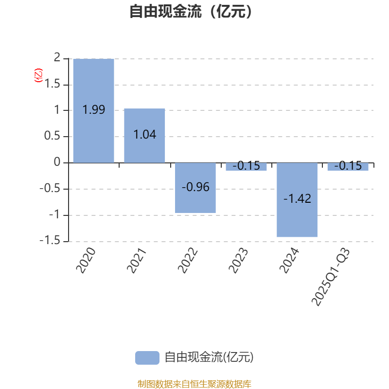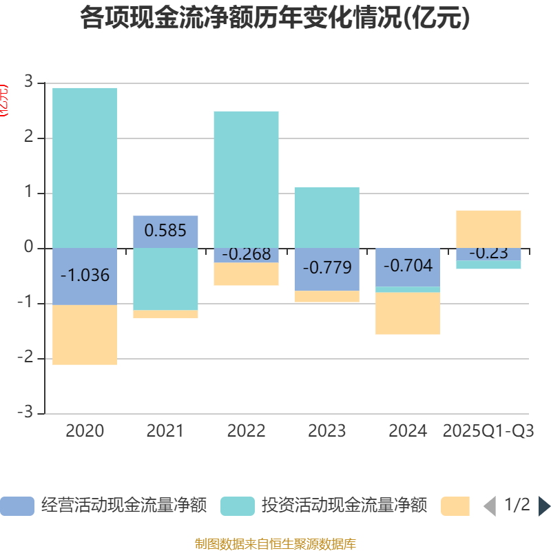 2025年前三季度,公司经营活动现金流净额为-2295.78万元,同比增加3262.7万元;筹资活动现金流净额6775.9万元,同比增加1.29亿元;投资活动现金流净额-1476.11万元,上年同期为-937.12万元。
