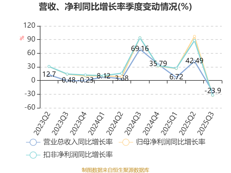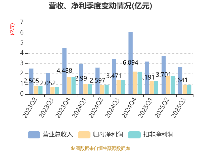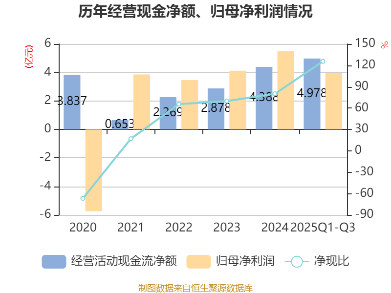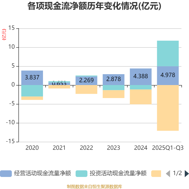 2025年前三季度,公司经营活动现金流净额为4.98亿元,同比增长102.5%;筹资活动现金流净额-12.1亿元,同比减少8.96亿元;投资活动现金流净额6.76亿元,上年同期为-8728.83万元。