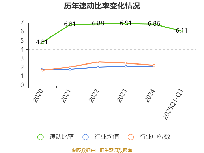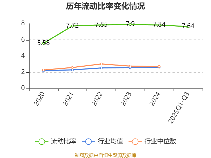 2025年前三季度,公司流动比率为7.64,速动比率为6.11。