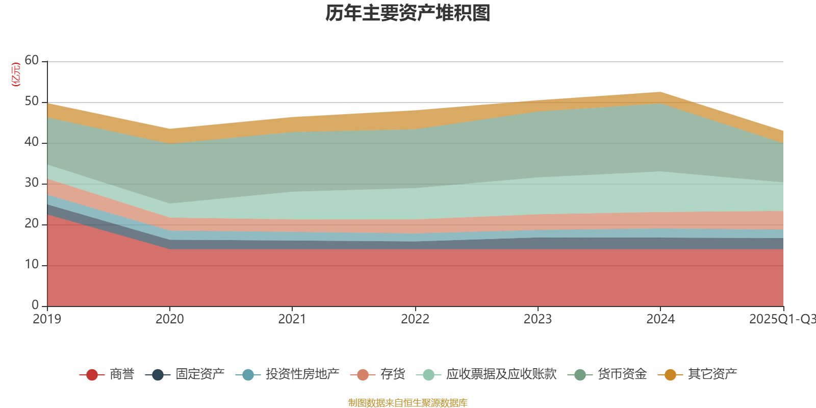 资产重大变化方面,截至2025年三季度末,公司货币资金较上年末减少42.22%,占公司总资产比重下降9.32个百分点;商誉较上年末没有变化,占公司总资产比重上升5.91个百分点;存货较上年末增加13.31%,占公司总资产比重上升2.96个百分点;应收票据及应收账款较上年末减少29.81%,占公司总资产比重下降2.68个百分点。
