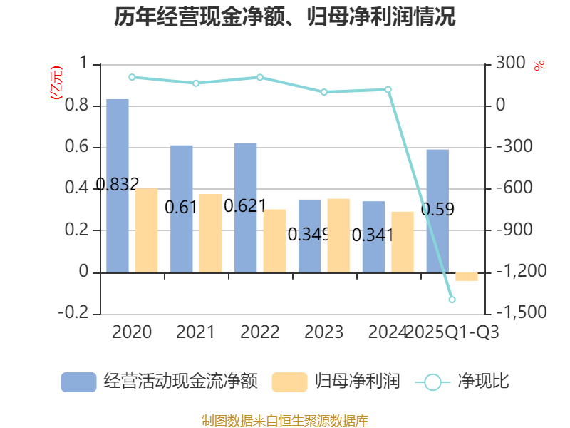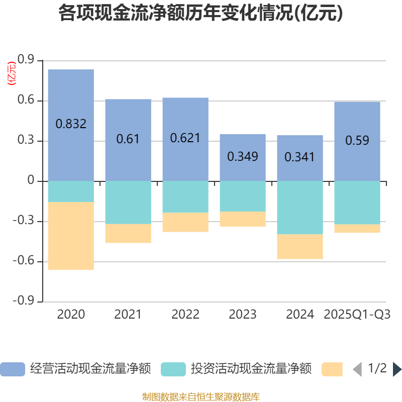 2025年前三季度,公司经营活动现金流净额为5898.56万元,同比增长108.07%;筹资活动现金流净额-620.31万元,同比增加1221.92万元;投资活动现金流净额-3247.67万元,上年同期为-3600.01万元。