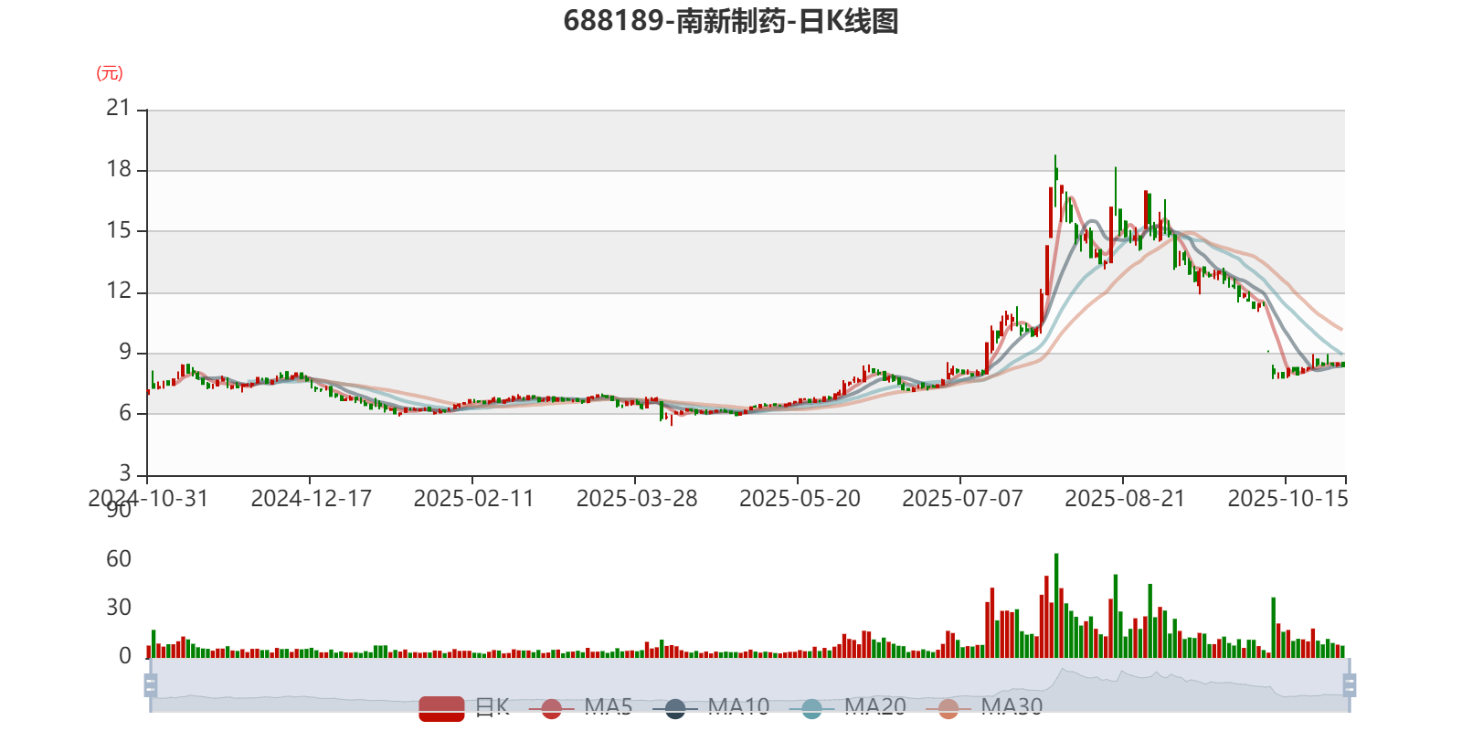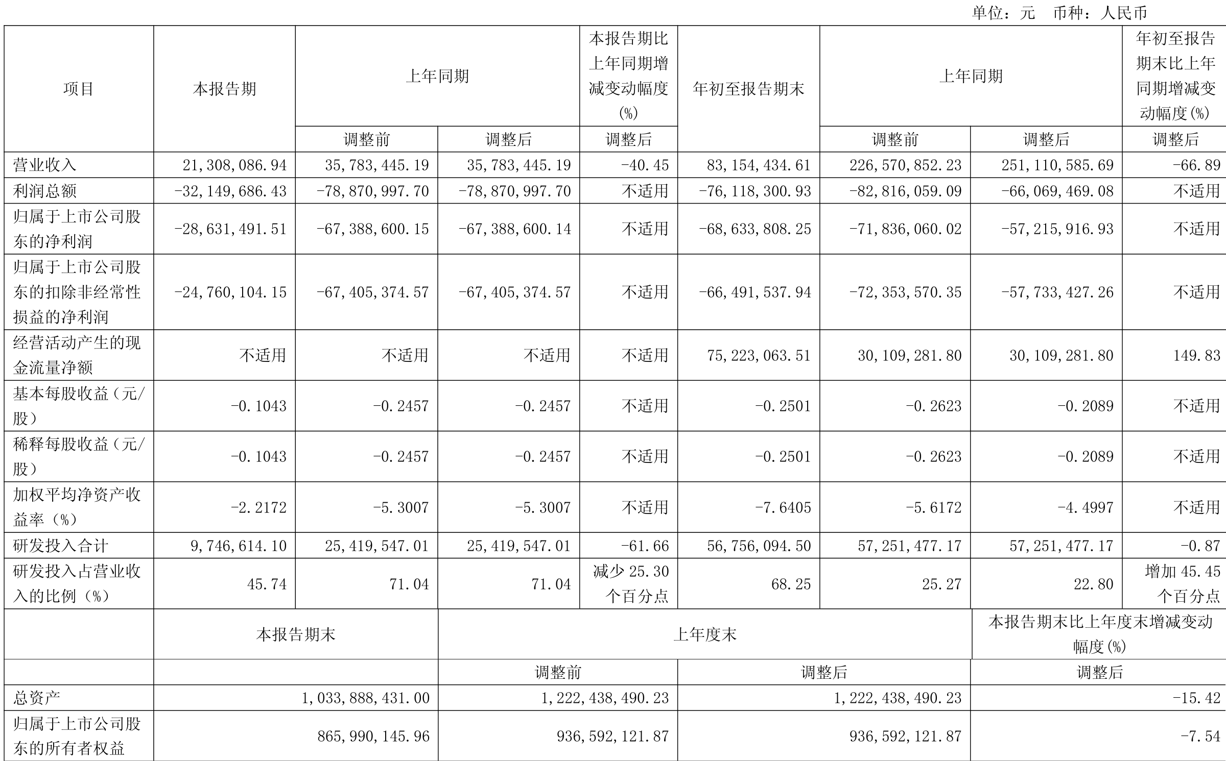 中证智能财讯南新制药(688189)10月31日披露2025年第三季度报告。前三季度公司实现营业总收入8315.44万元,同比下降66.89%;归母净利润亏损6863.38万元,上年同期亏损5721.59万元;扣非净利润亏损6649.15万元,上年同期亏损5773.34万元;经营活动产生的现金流量净额为7522.31万元,同比增长149.83%;报告期内,南新制药基本每股收益为-0.2501元,加权平均净资产收益率为-7.64%。