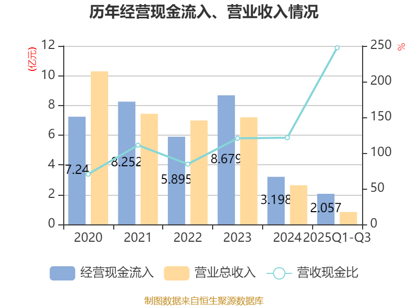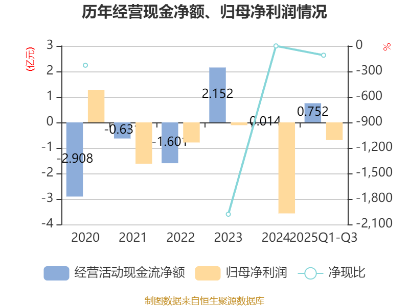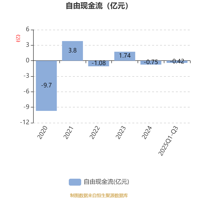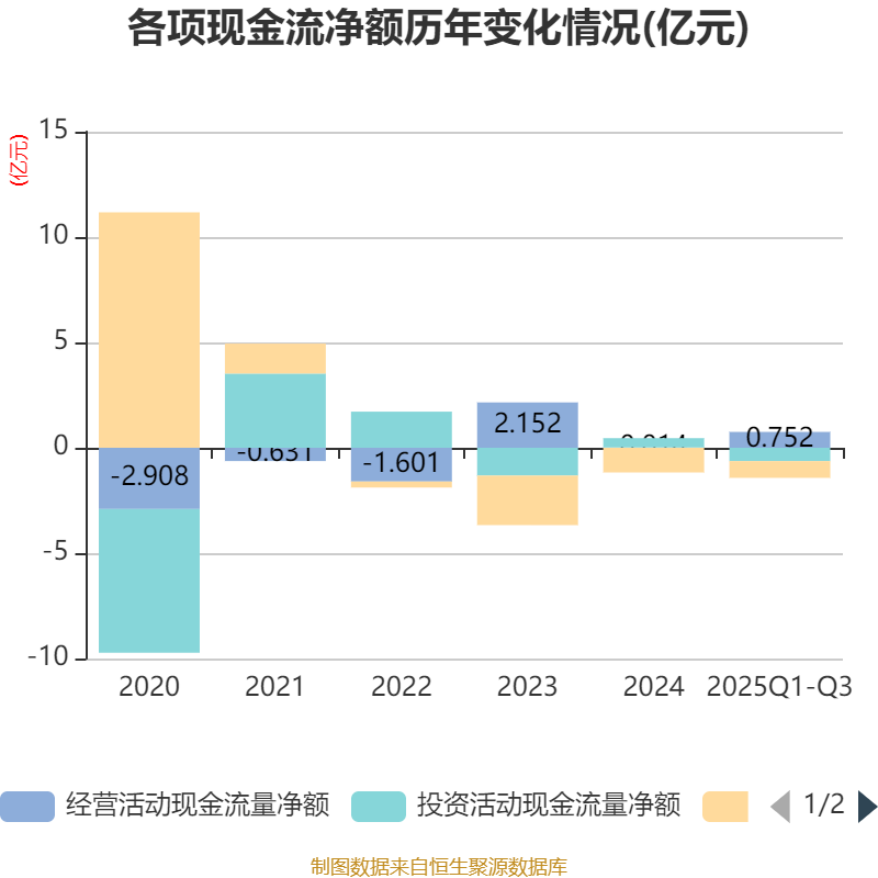 2025年前三季度,公司经营活动现金流净额为7522.31万元,同比增长149.83%;筹资活动现金流净额-7958.51万元,同比增加1.9亿元;投资活动现金流净额-6324.51万元,上年同期为6633.62万元。
