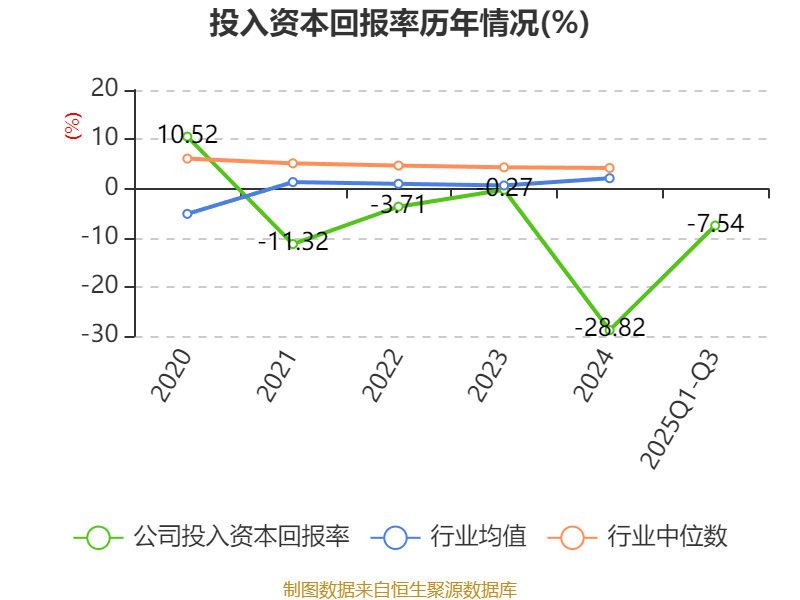 盈利能力方面, 2025年前三季度公司加权平均净资产收益率为-7.64%,同比下降3.14个百分点。公司2025年前三季度投入资本回报率为-7.54%,较上年同期下降2.83个百分点。